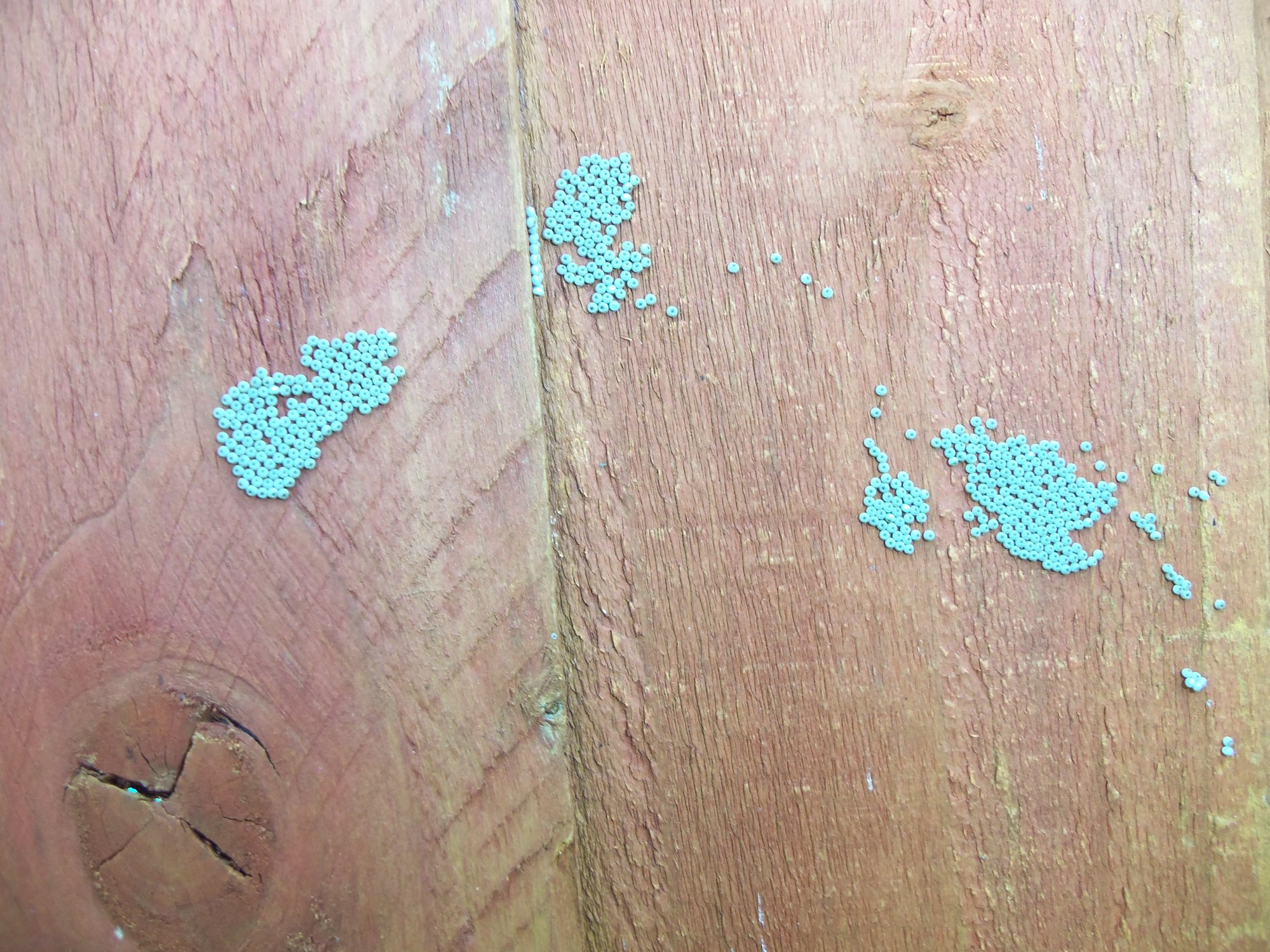 I've just noticed these on a north-facing fence, though they may have been there any length of time. They are about the size of poppy seeds, and though the picture makes them look grey-green, they're really beige, and each has a dark spot facing outwards. Insects usually lay eggs on something the larvae can eat, but I would have thought wood-borers would lay their eggs inside their tunnels, where the eggs and larvae are safe from predators.