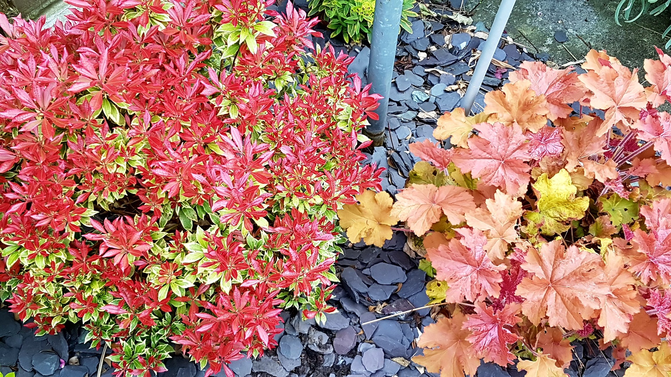 I've got red and lime from various types of berberis, pieris and imperata red baron, blue from picea pungens, juniperus blue star and festuca glauca, yellow and orange from erica tweety and nandina firepower and purple from pittosporum tom thumb and weigela.