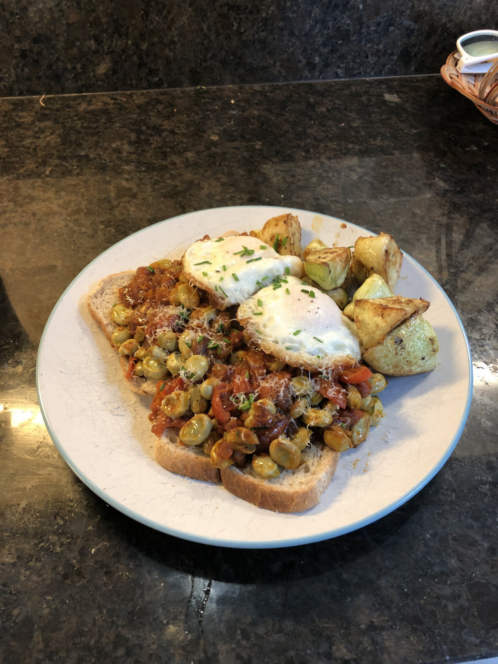Saute some onion, when soft, add a couple cloves of crushed garlic, smoked paprika, chilli powder, cumin and oregano. After a couple of minutes, add your broad beans and some chopped tomatoes. Bit of water to loosen it up and a bit of sugar. Simmer for 5-10 mins till beans are cooked. Add a splash of balsamic vinegar.