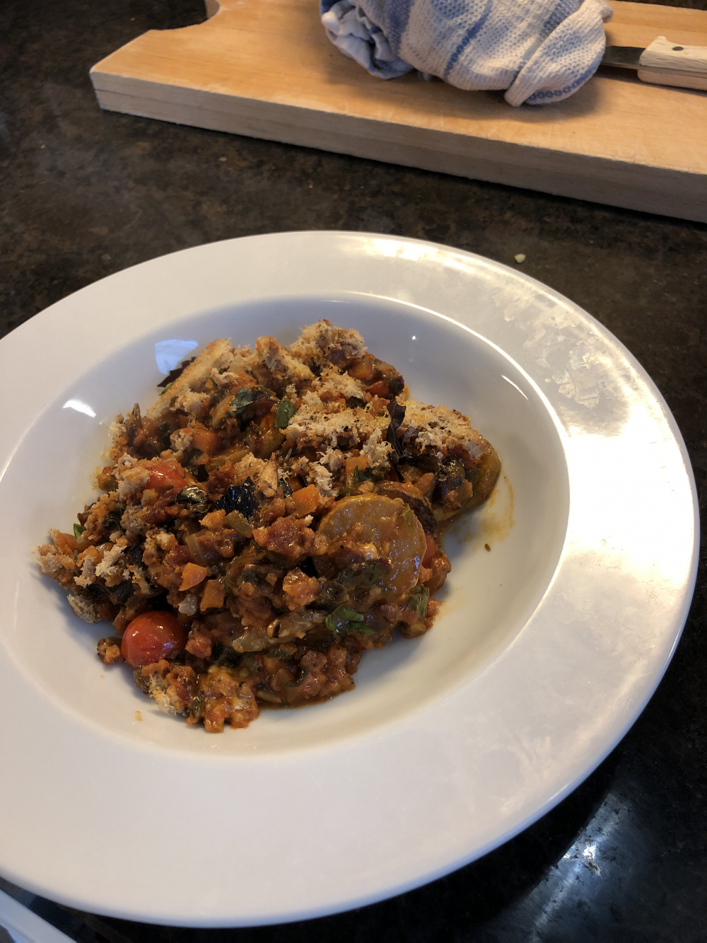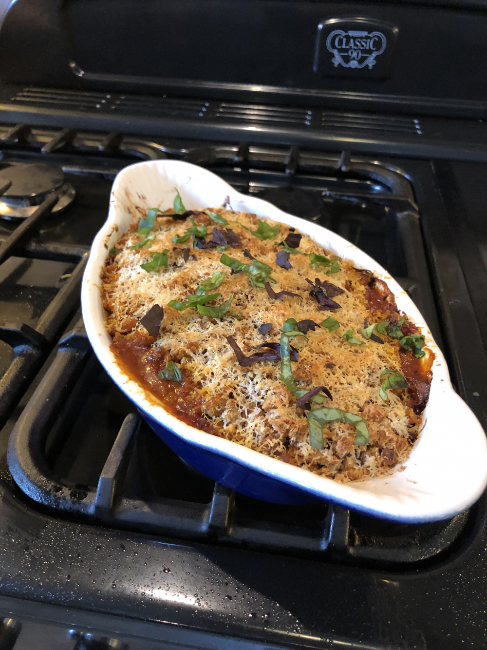 Slightly random recipe based on what I had to use up, but worked pretty well. I used tromboncino but works well with aubergine (melanzana parimigiana), courgette or other summer squash. -Finely chop onion, carrot, celery and Swiss chard stalks. Fry in olive oil till soft and starting to brown. -Add in chopped chilli and crushed garlic. Don’t let the garlic burn. -Add tomato purée, vegetable stock, a little sugar and a dash of balsamic vinegar. -Add in the chopped chard leaves and some orgegano, basil and thyme. -Simmer gently for about 15 mins. -While the sauce cooks, peel the tromboncino and cut into slices about 0.5cm thick. Season and fry in olive oil till just brown. -Lay the slices over the base of an oven dish. Add some mozzarella and halved cherry tomatoes. -Pour over the sauce. Cover with bread crumbs and grated Parmesan. -Bake at about 200°C till the top is nicely brown. Finish of with some fresh basil. -Enjoy!