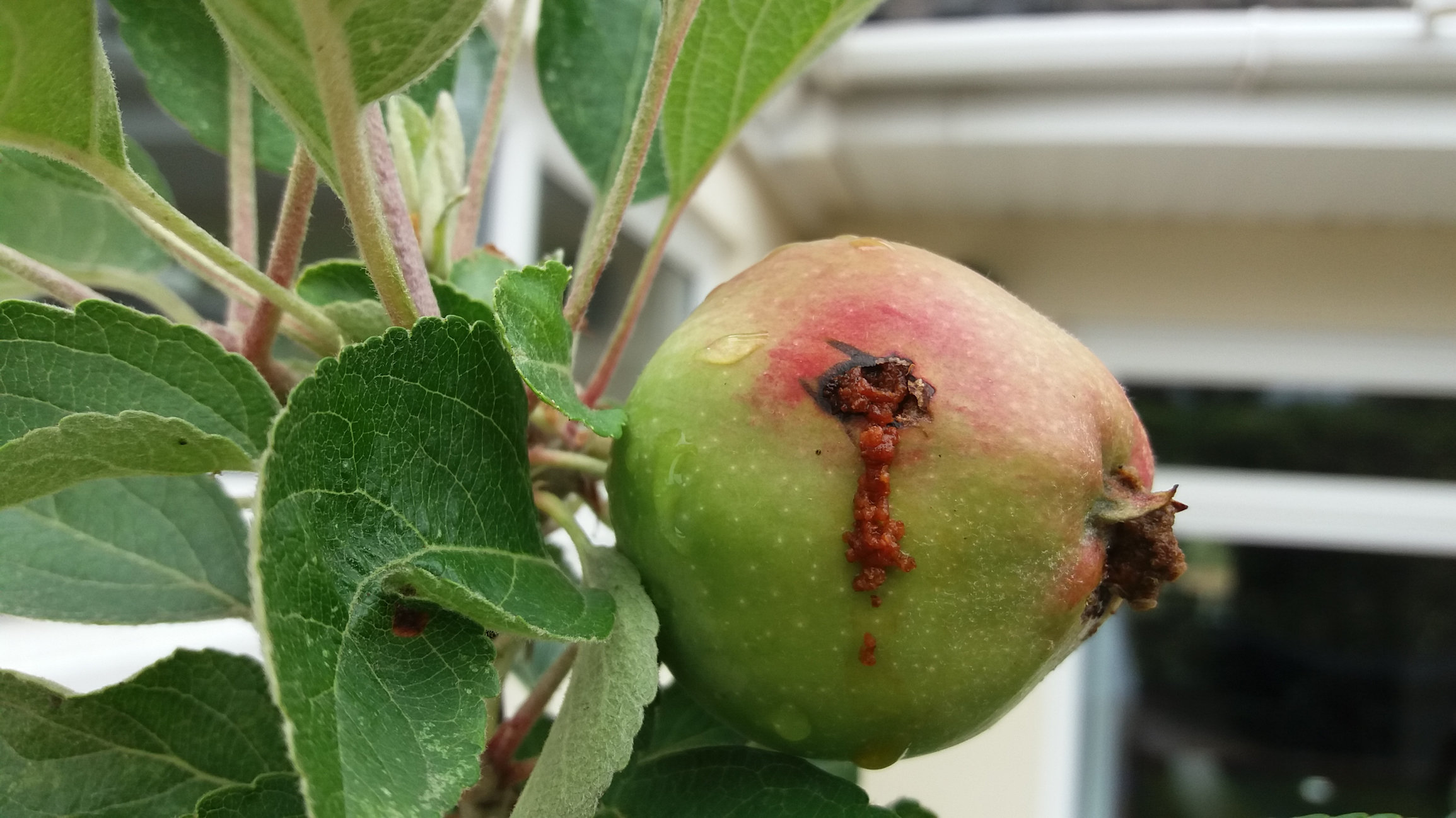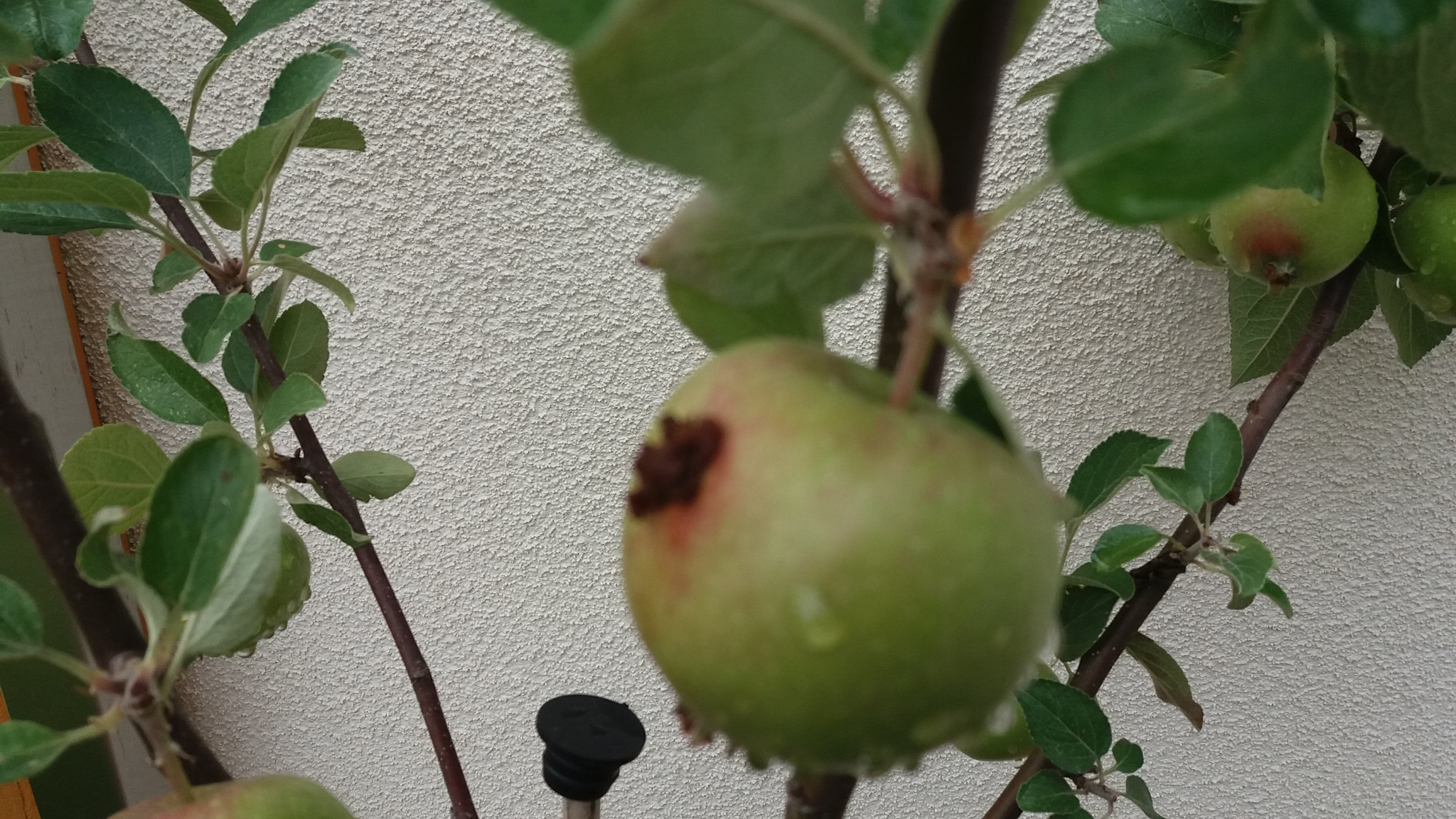 I recently bought a small Braeburn apple tree, which is bearing fruit. However some of the apples have a brown crust that appears to be erupting from the apple (see attached photos). I wondered if this was caused by something wrong that I am doing or whether it is a disease etc. I have kept the tree well watered through the recent hot spell.