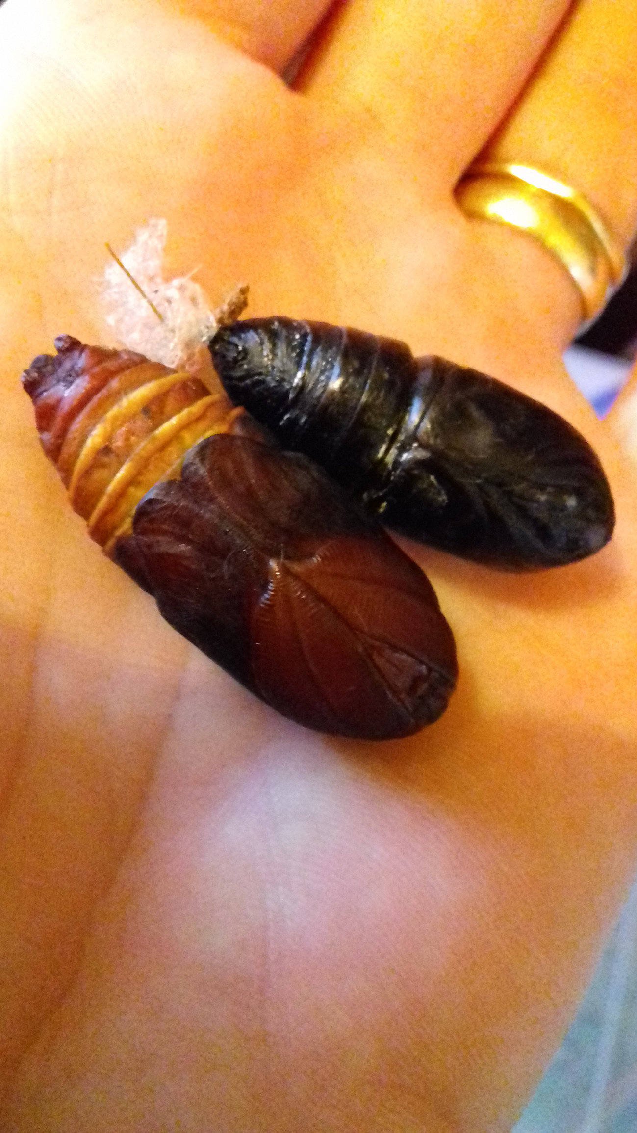 Meet my current pupae I suspect that the Suraka at the top has deceased because it is so black and lightweight but so was the other that hatched. (This species barely wiggles) And the bigger one is a male Atlas moth. I hope they hatch in time to mate with the females but it seems a bit pot luck.