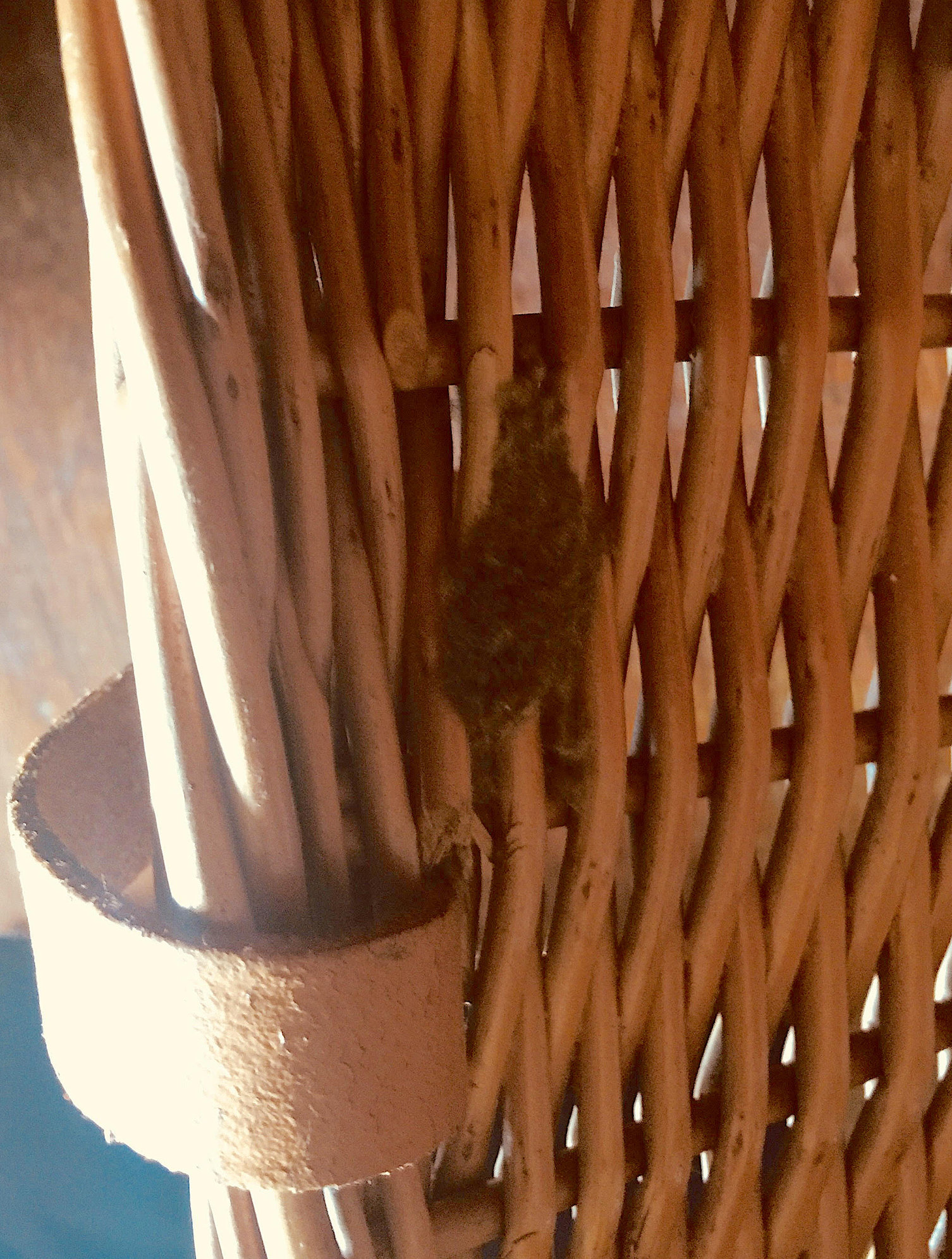 Thanks. I saw her laying the eggs, I just didn't know what it was. I saw a friend today who knows about moths and he confirmed the fluff is where the eggs are. I guess she had mated (in the pictures) and the basket was the best place she could manage for her eggs at the time. I got confused because I thought she had got out and I left the basket open. I think that perhaps she had crawled into the wicker work and I couldn't see her. I didn't really manage the whole thing very well. I don't expect the eggs would mature.
