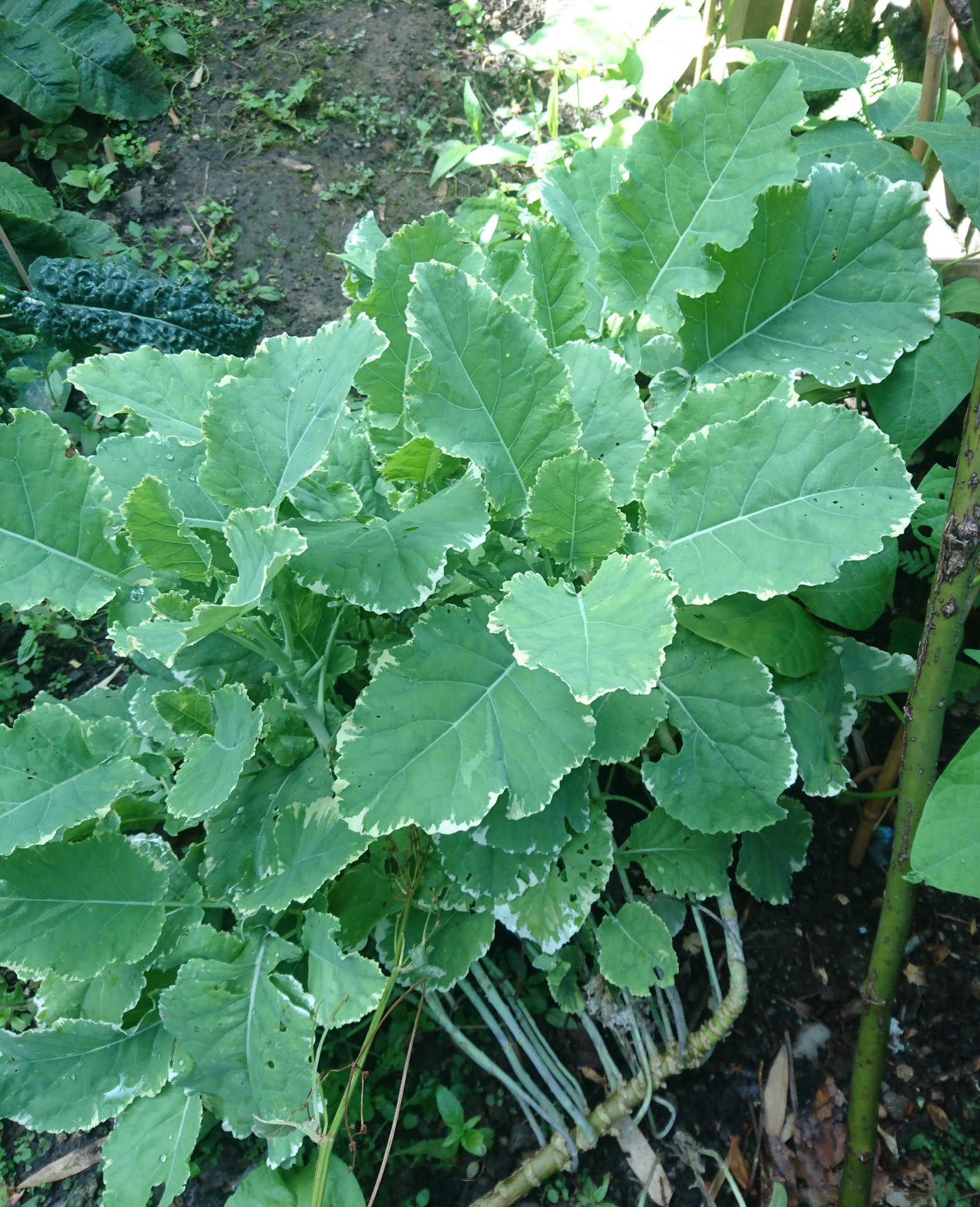 Hello! I'd like some help IDing what I'm pretty sure I bought as a kind of kale perhaps last year. I bought it here in Scotland as a smaller plant, not as seeds. But, raw, it tastes unpalatably bitter unlike curly kale or the cavolo nero that's also in the garden. The leaves are quite flat, quite a pale green with a waxy covering that's almost oily. Cabbage worm does lay on them. Many leaves have a distinctive white edge which I have not been able to identify online. I started to wonder if I was mistaken about it being kale but have just roasted some leaves and cooked it does taste delicious just like kale crisps. Any ideas if it is kale and if so which type?