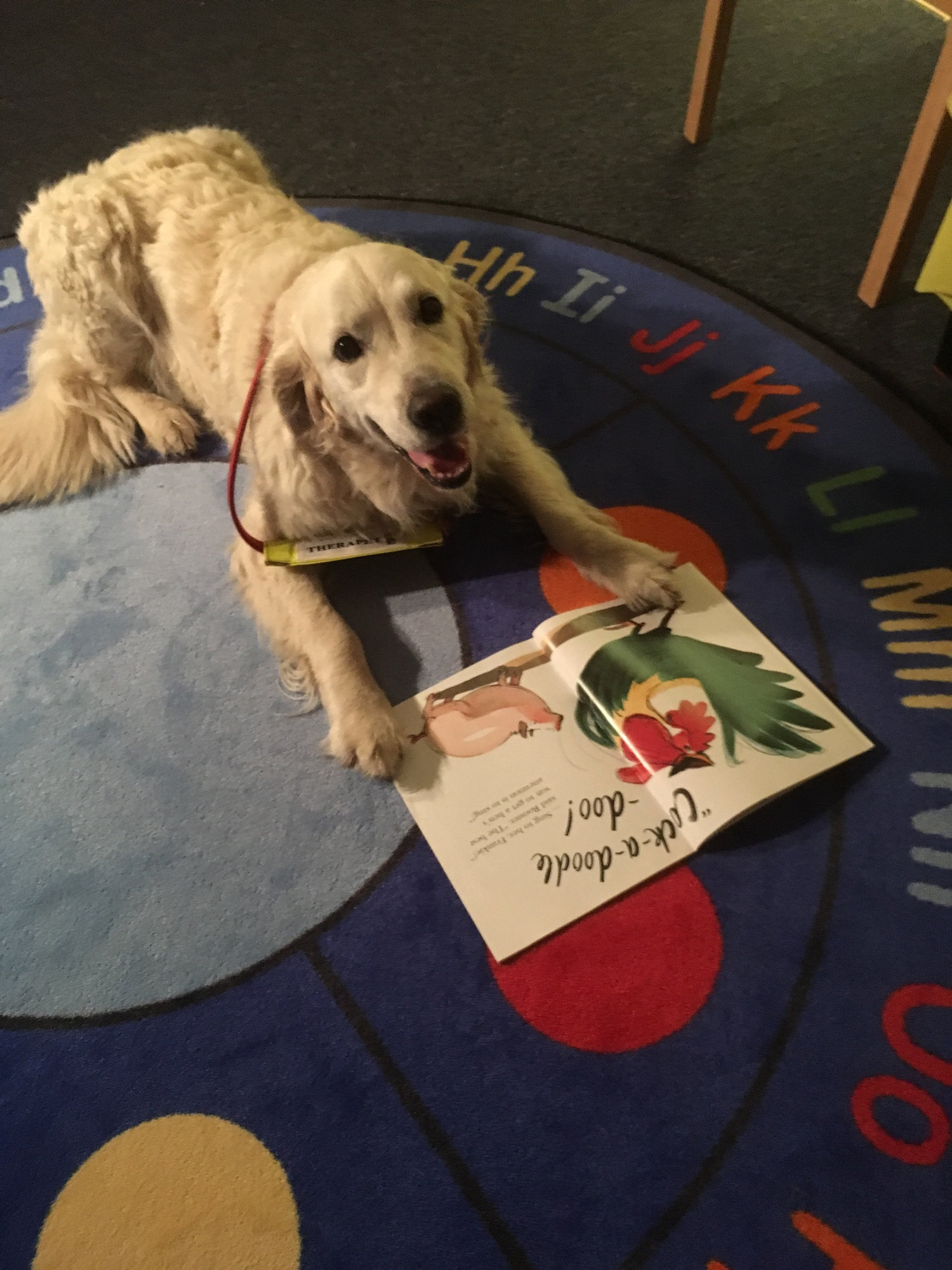 Canine Concern Scotland is who we work for. We do Read2Dogs with primary kids, many have been traumatised by dogs then we also do Paws for Stress and go to the universities at exam time (many students have had to be separated from beloved pets) finally we visit the local care homes and hospitals. Talla! The white one! has a years waiting list for her, not me I am just the handler!