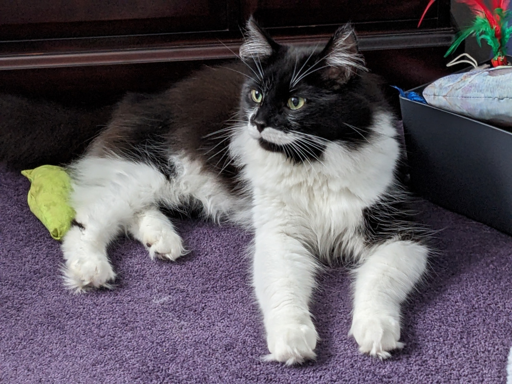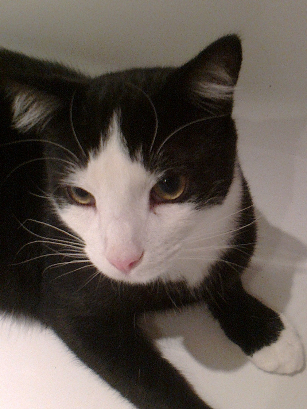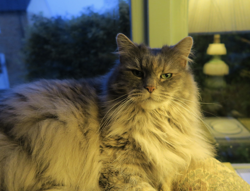 His birthday is soon but we're not sure when as he was found half dead in a box with his four siblings. The were riddled with worms and had terrible cat flu. Now, almost a year on, he is lying beside me and is a great big lump (knocking on 7kilos) and also a menace.