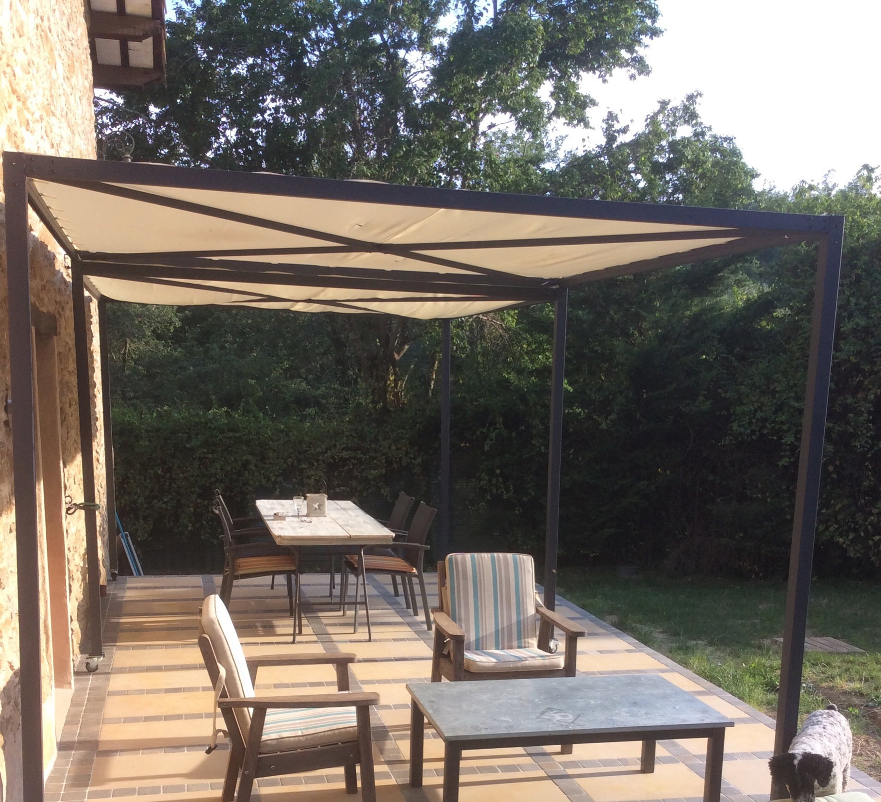 We nearly bought a very expensive ‘Classique’ freestanding wooden pergola with a waterproofed fabric retractable roof from Unipiu but they mucked up the order. Instead, we bought a (not waterproof) extending metal pergola on wheels for a sixth of the price from a diy store. One half rolls under the other if you want full sun. We are thinking of waterproofing the ‘permanent’ half over the table so we can use it on rainy days: