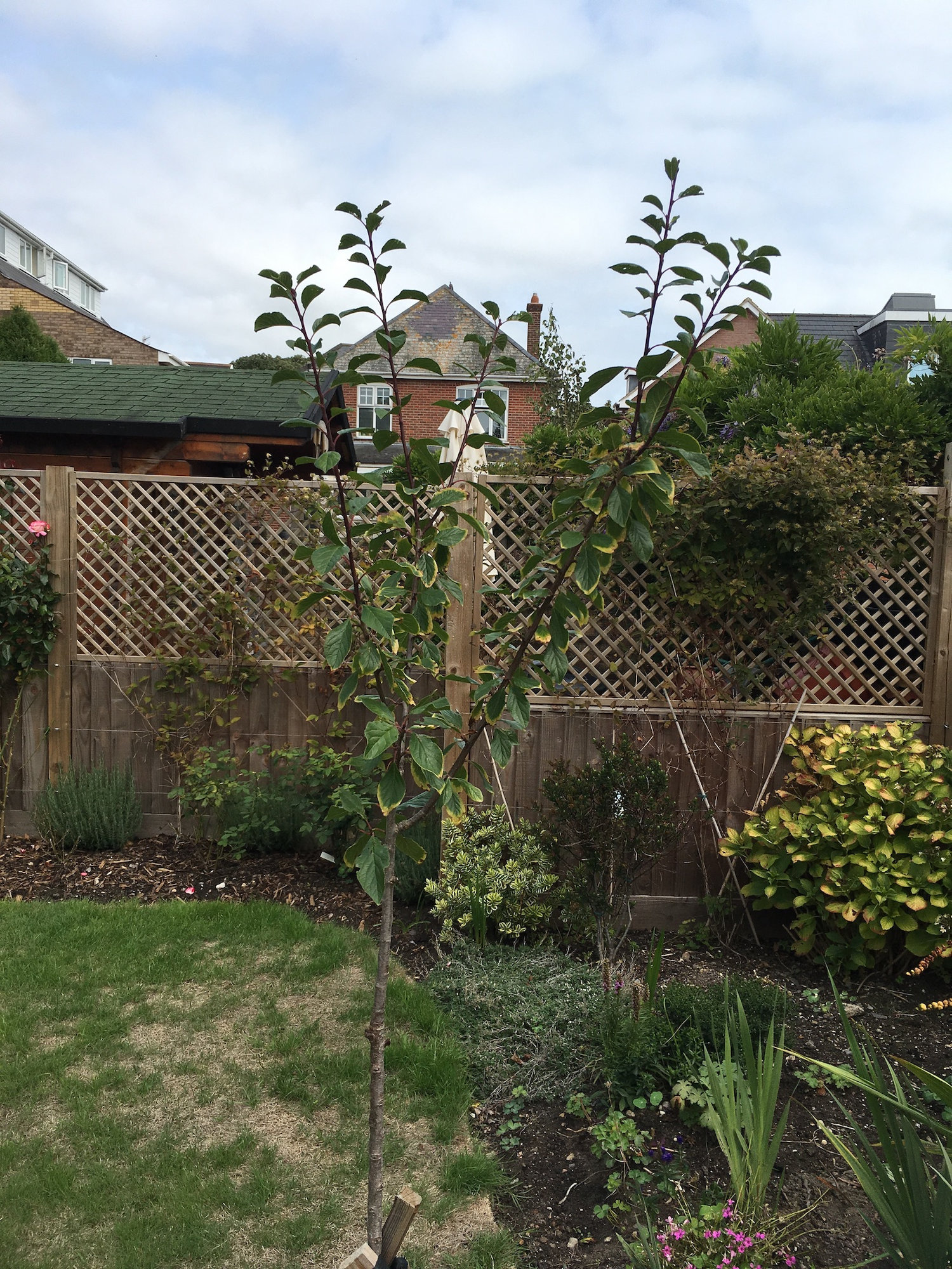 A year after it was planted, I removed lower branches, leaving the goblet shape for now. It is a bit lopsided as I think one can see.