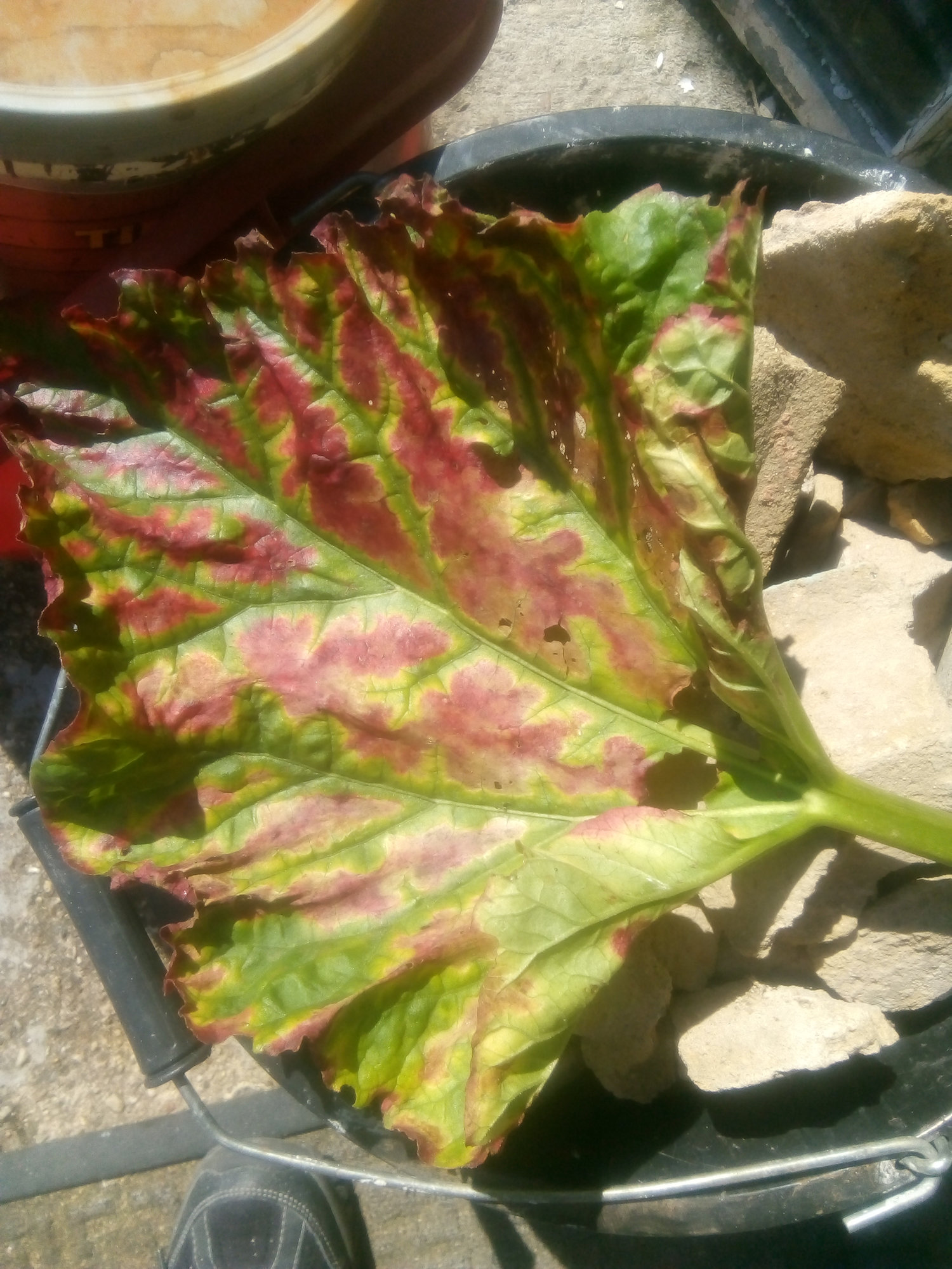 I have bright red leaves on my rhubard plants,I have read that this is a disease and the plant must be dug up.there have only been 3 leaves like this the rest of the plant looks healthy. can anyone out some light on this? Regards rich.
