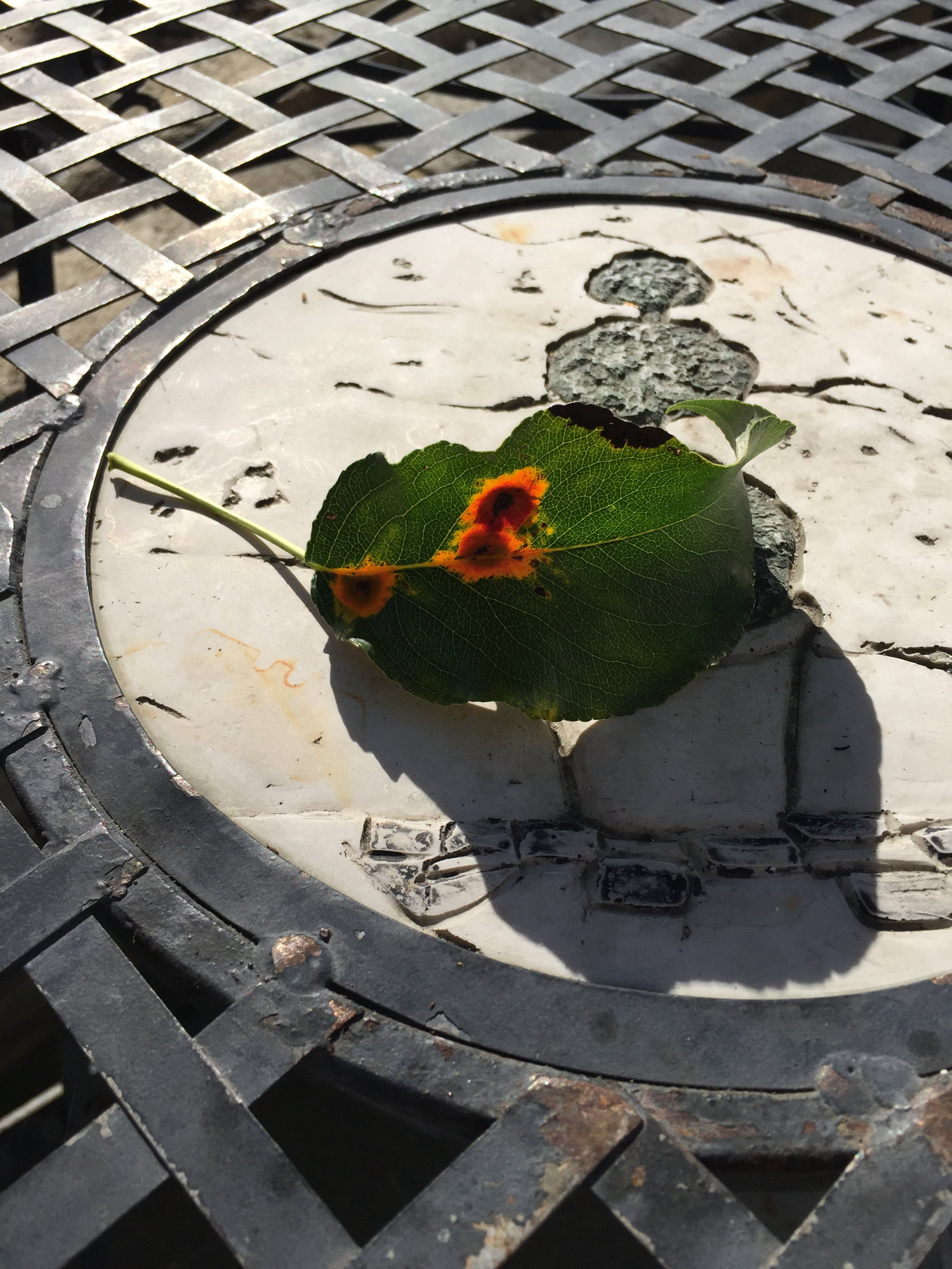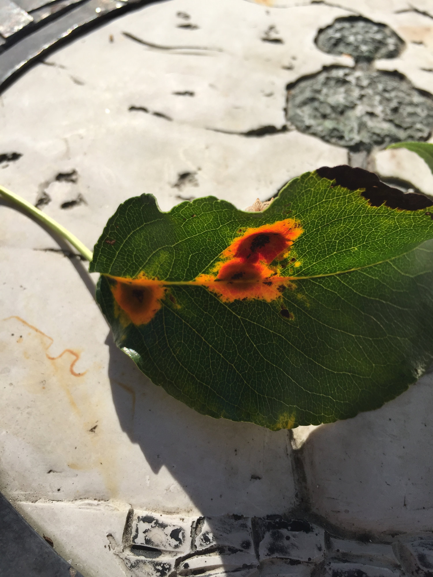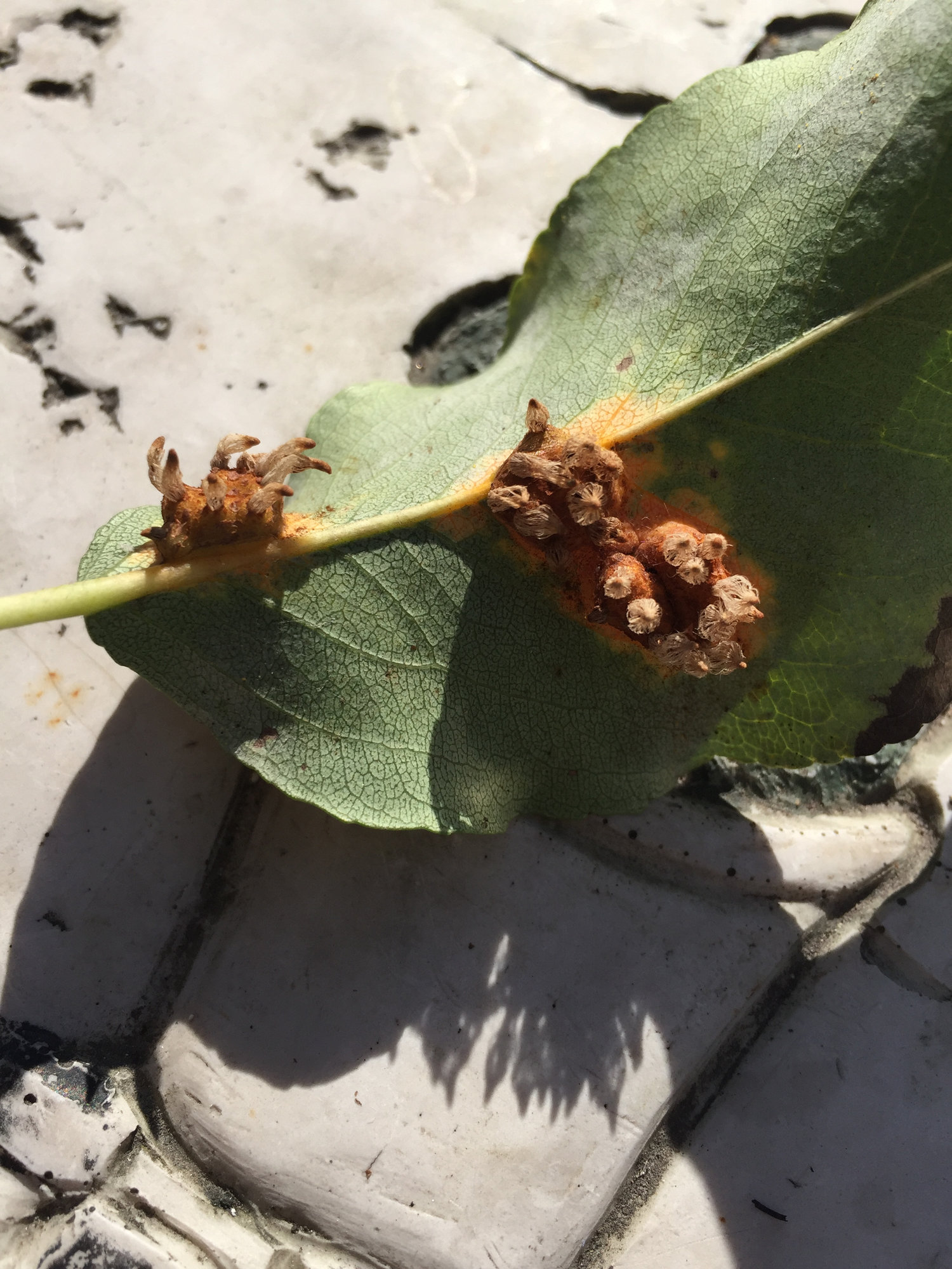 At this time of year the 'explosions' on the back of the leaves release the spores and they find a home on a Juniper to over-winter. In the Spring the spores that have been produced on the Juniper are only able to infect Pear trees - and so the cycle continues.