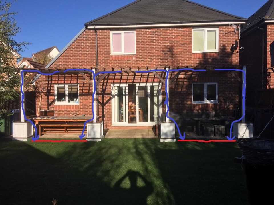 Where I've put the red lines, I would remove those strips of turf, they're not necessary, you've got plenty of lawn... dig it over a bit... where I've got the blue arrows plant your vines or whatever directly into soil and start training them up the posts.. a slight reservation about the right hand side, as a tree seems to case some shadow, but no bother..