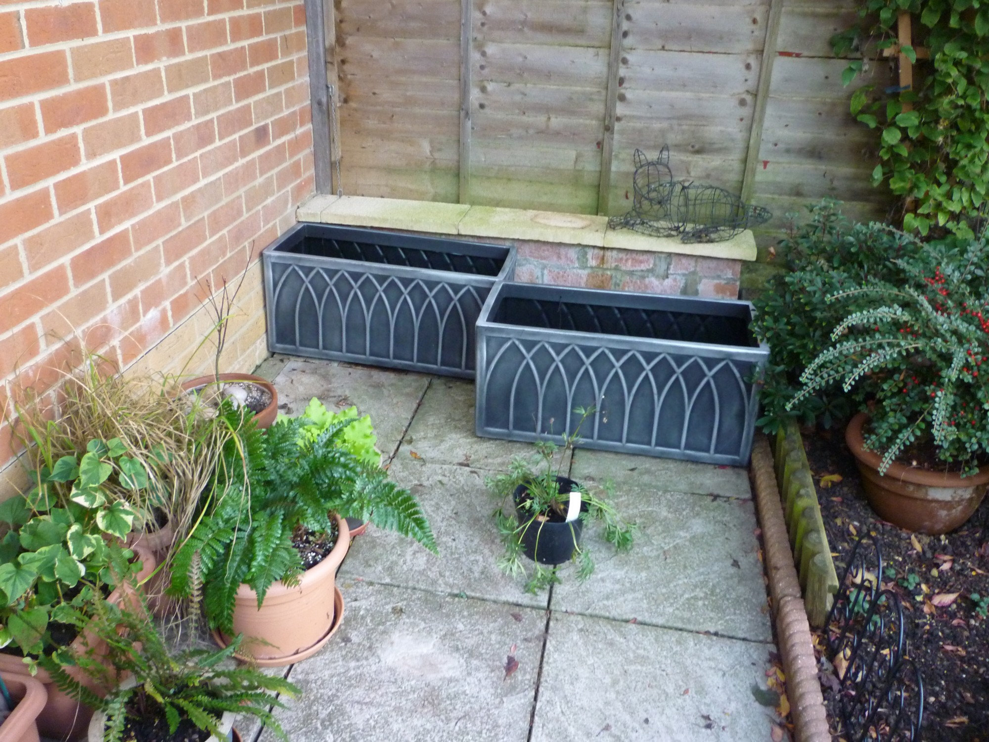 That's exactly what I'm doing hogweed. Although I only have enough height for one. Think I suggested that - can't remember The ferns are a good idea - but there are lots of plants you could have there. I've done that on my back fence with various troughs/baskets, and the containers blend into and among the ivy and the other plants to make a green wall type of effect. I've got all sorts in them - hellebores, heucheras, geraniums and bulbs etc. Very low maintenance too.