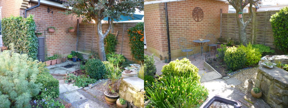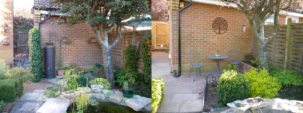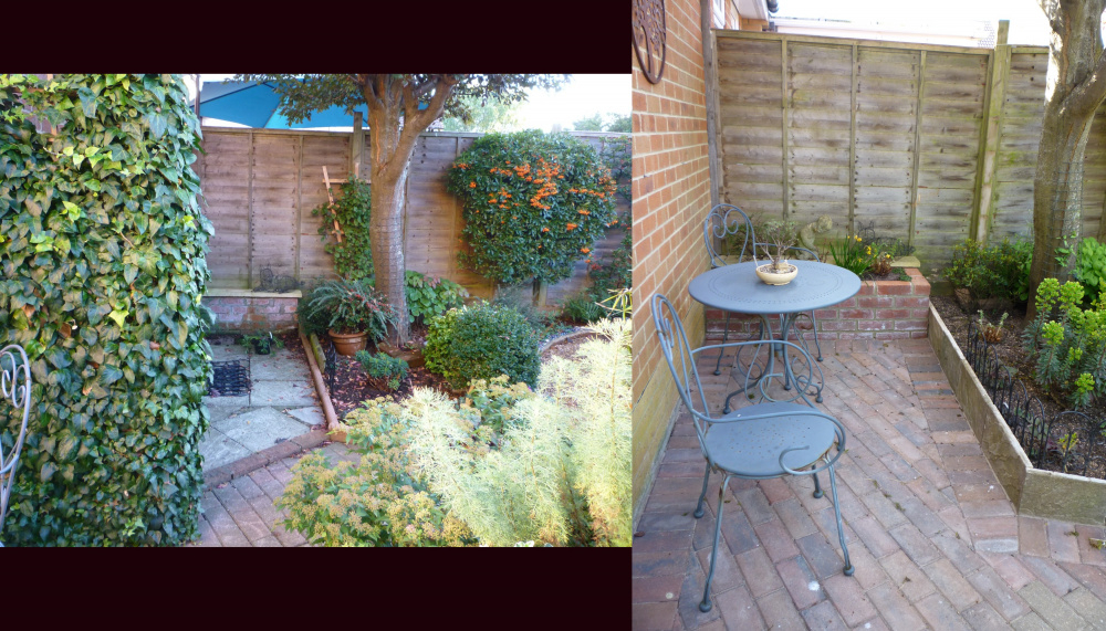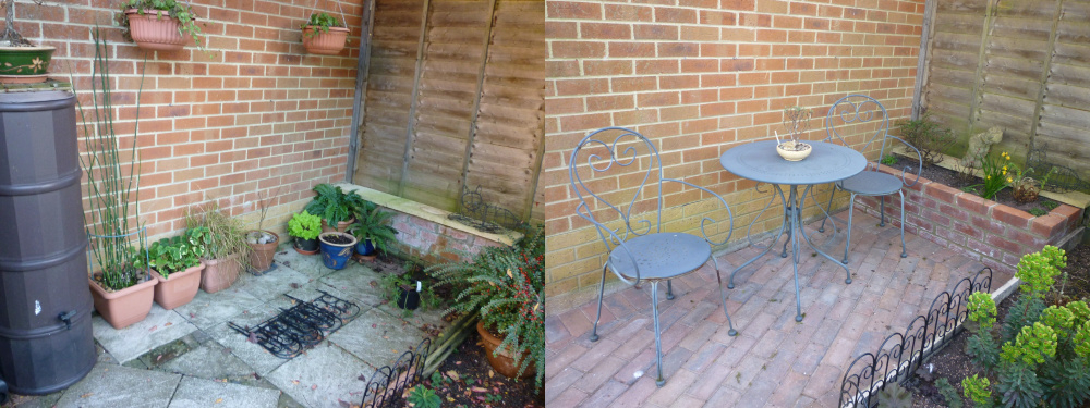 Just an update on the bit behind the garage. Went through a few ideas but not really happy with them. In the end I took the trellis with ivy away completely,sold the water butt,got builders to pave and level the area to the existing patio and build a small brick raised bed.Rope edges removed and the original slabs laid on their edge as a border so soil is retained. The raised bed has a Cotoneaster which will be trained up the fence and some ferns etc. Since the neighbours fence is in need of replacement after the storms I am training the Clematis 'Justa' towards the cherry tree this year. Obviously everything needs to mature for a bit and get going but I now actually like sitting there now and like the space!