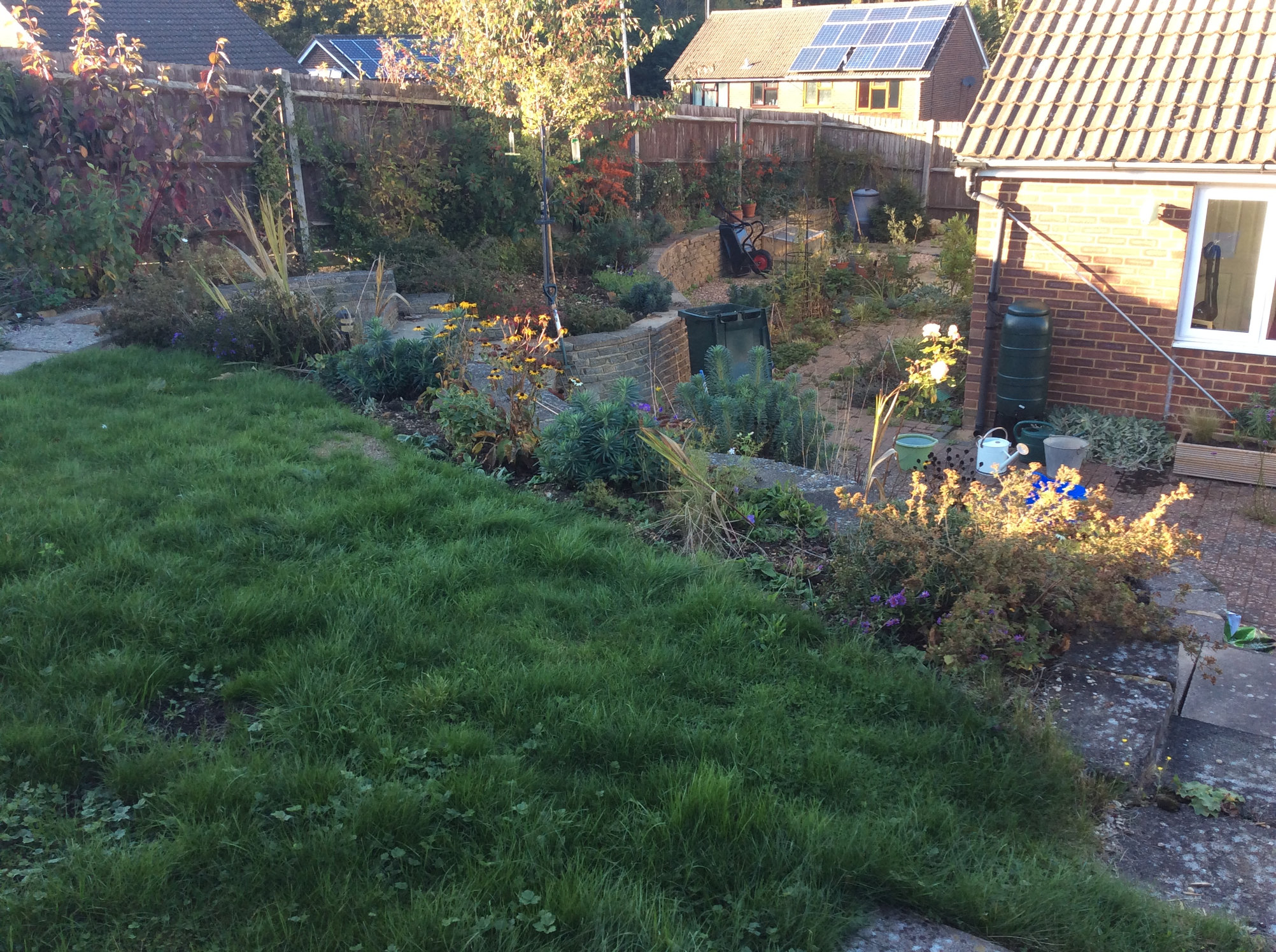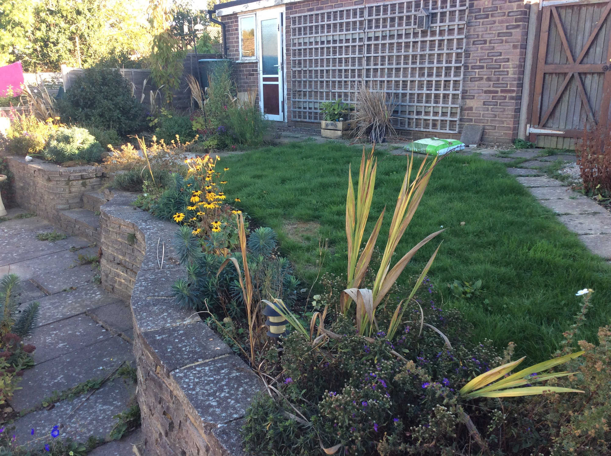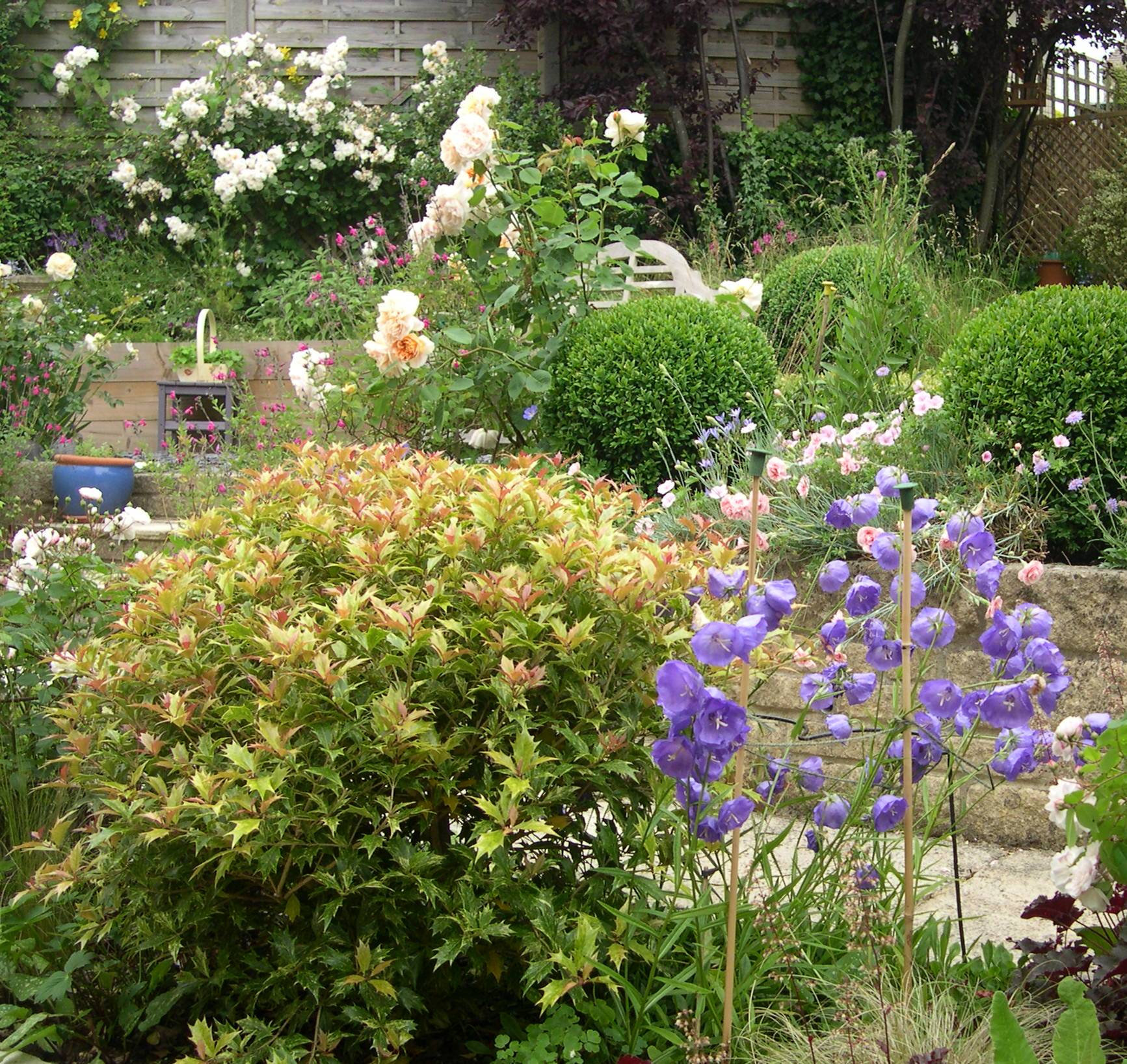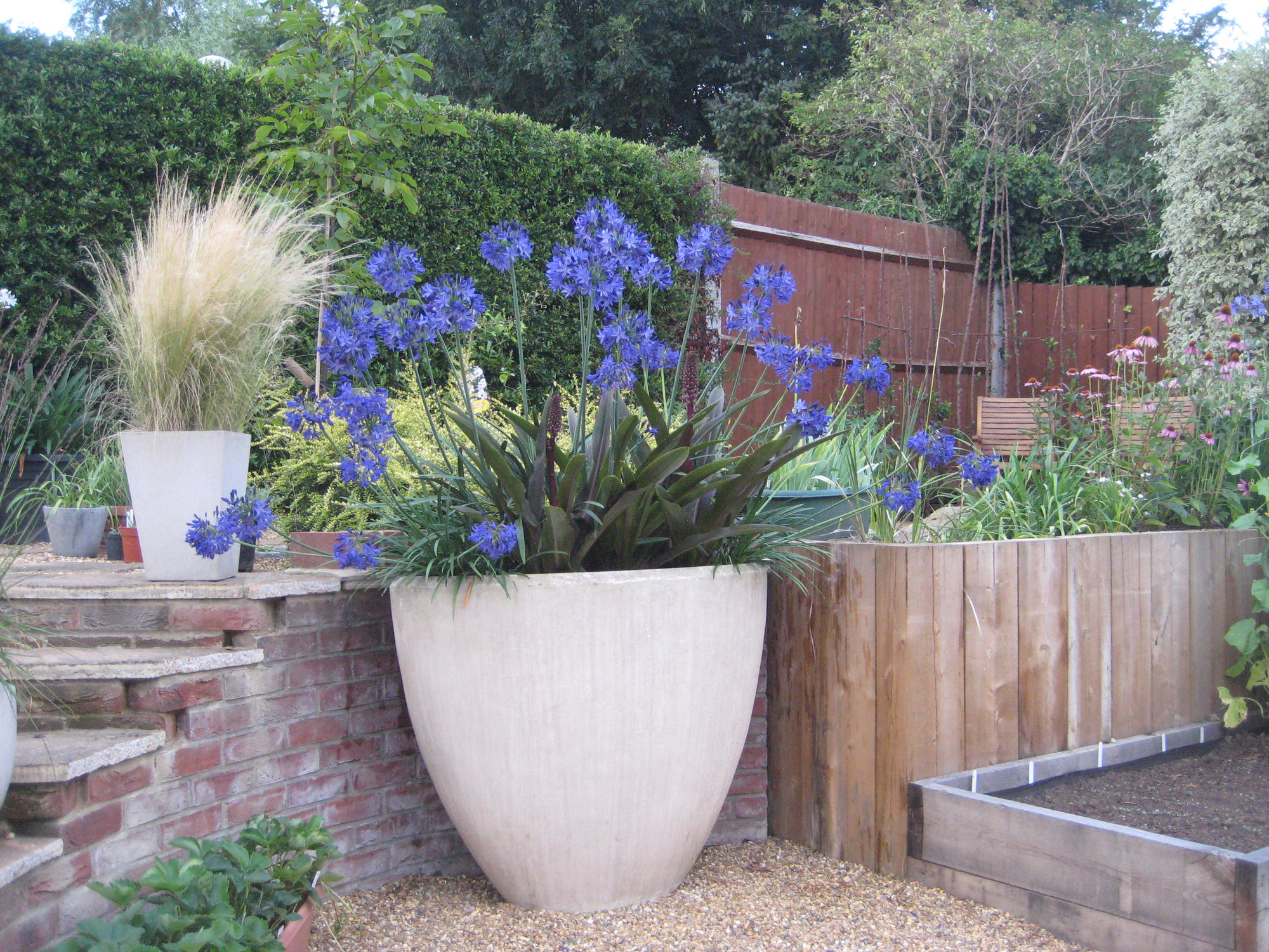 The other side of the garden, with more pots, tall plants, grasses to give movement.