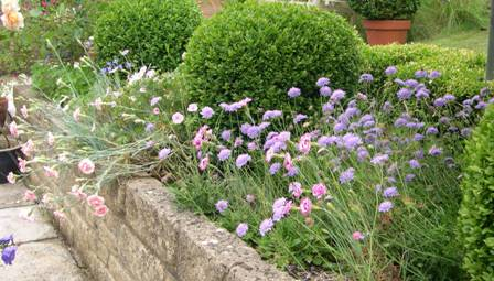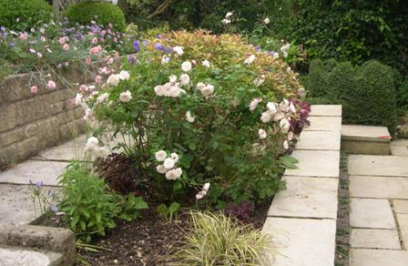 A Cotoneaster completely hiding a retaining wall, which acts as a nice foil for other plants, plus lots of pots, which break up the lines of the hard landscaping.