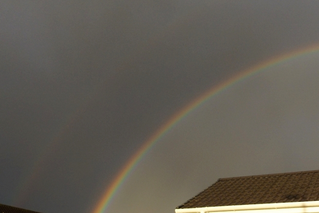 Afties all. I expect Pat has retired for the evening I used to make my pudding around this time of year, but we don't do them now. Not enough of us to eat it. I love them though, so usually just buy a couple of individual ones for me and eldest daughter. Don't do a cake now either. Daughter soemtimes does one though, and hse's very good at them. I could easily eat the entire thing by myself, so it's a bad idea really.... Been a wee bit absent from here in the last few days, so no idea what's been happening. I'll wish everyone well, and hope that no one's under the weather. Daughter has a lurgy and has kindly shared it with me. Busy day at work. A lady phoned to say her order was wrong, and was very sorry she hadn't checked after picking it up, so we had to stay a bit longer as the show's this weekend. I think it was the boss's fault. She'd written 4 ofone size, and it should have been 46, so we had to get to it and make 42 more rosettes for her to come and collect this afternoon. Happy days! Weather's been rough this week - cold, wet, wild and windy, but to be a bit better over the weekend, so I'm keeping my fingers crossed. We had a lovely double rainbow the other morning, with some leaden skies behind which were full of hail/sleet. I just got to the camera in time, before one disappeared completely, but it's a bit faint