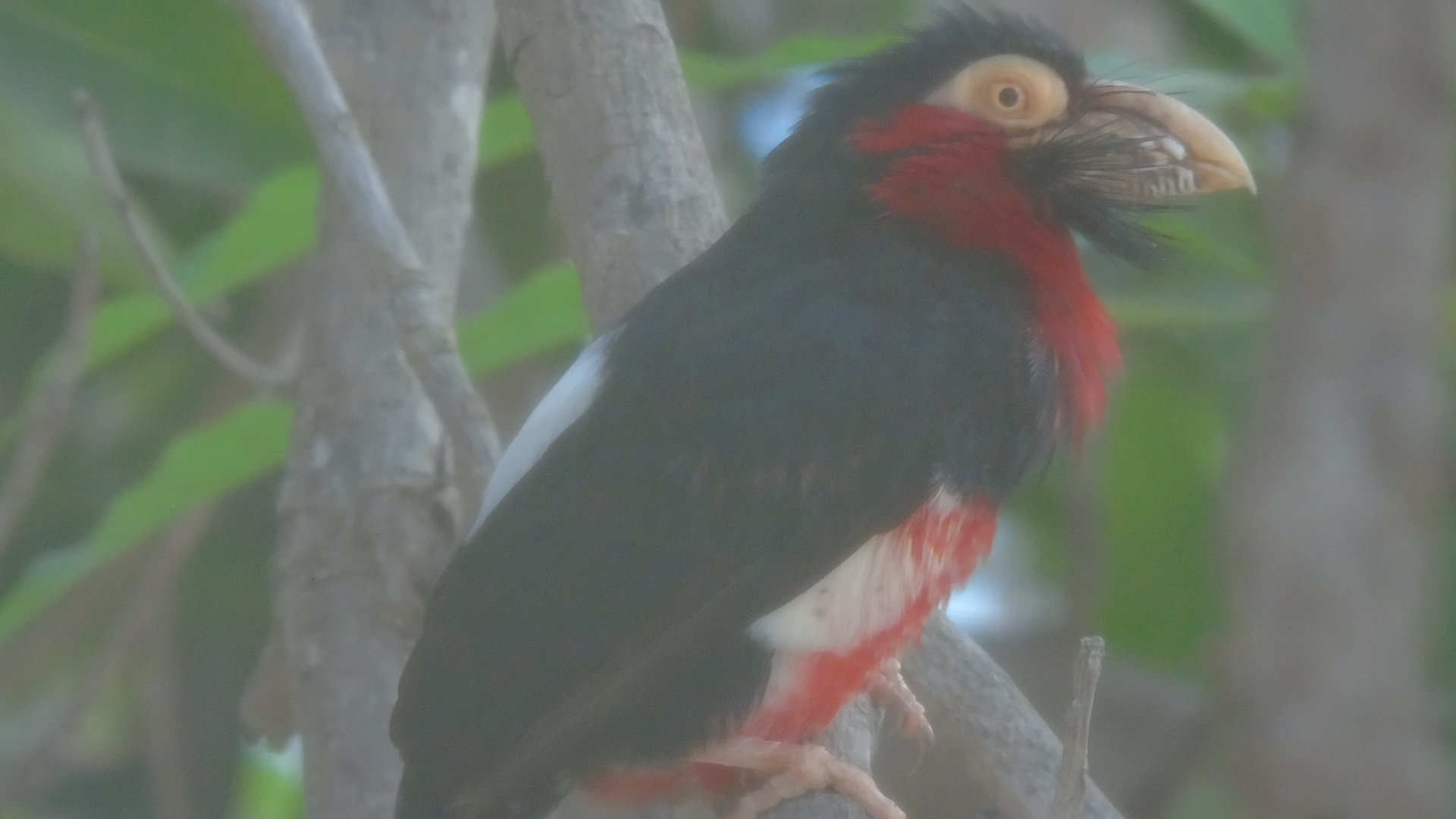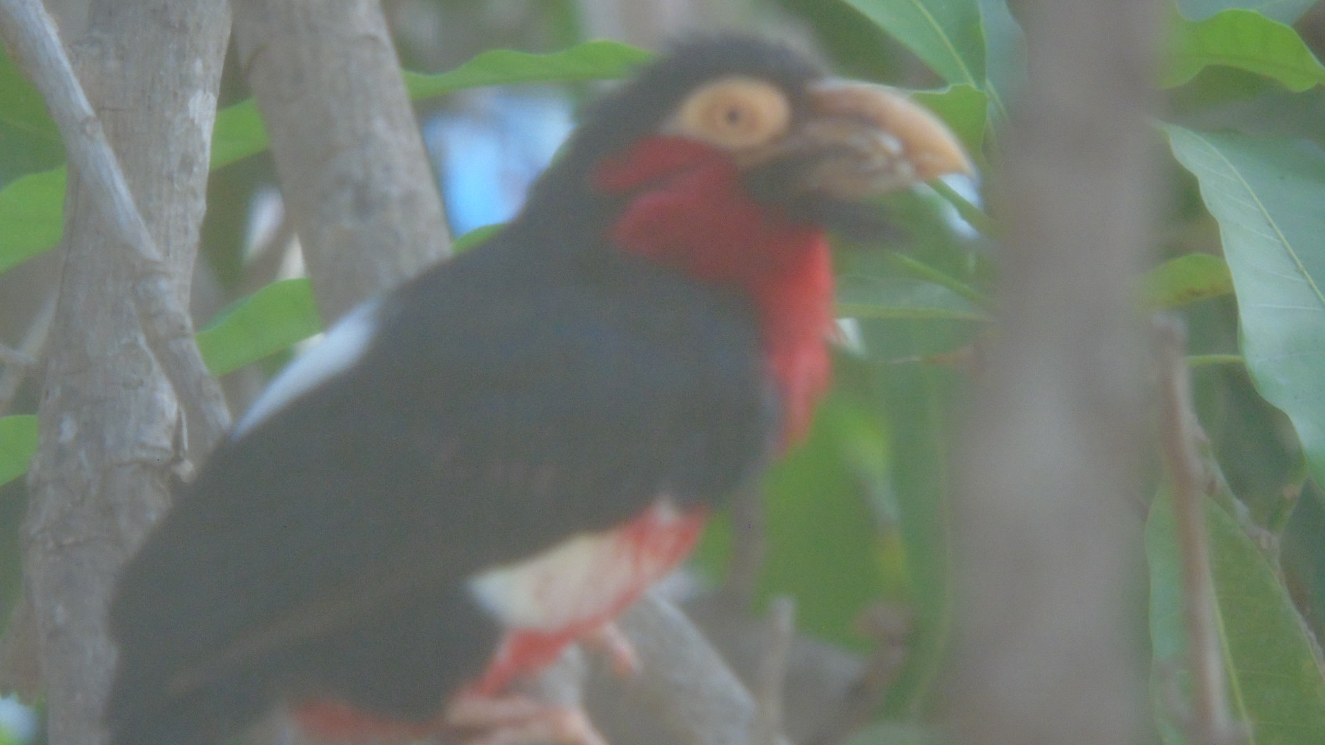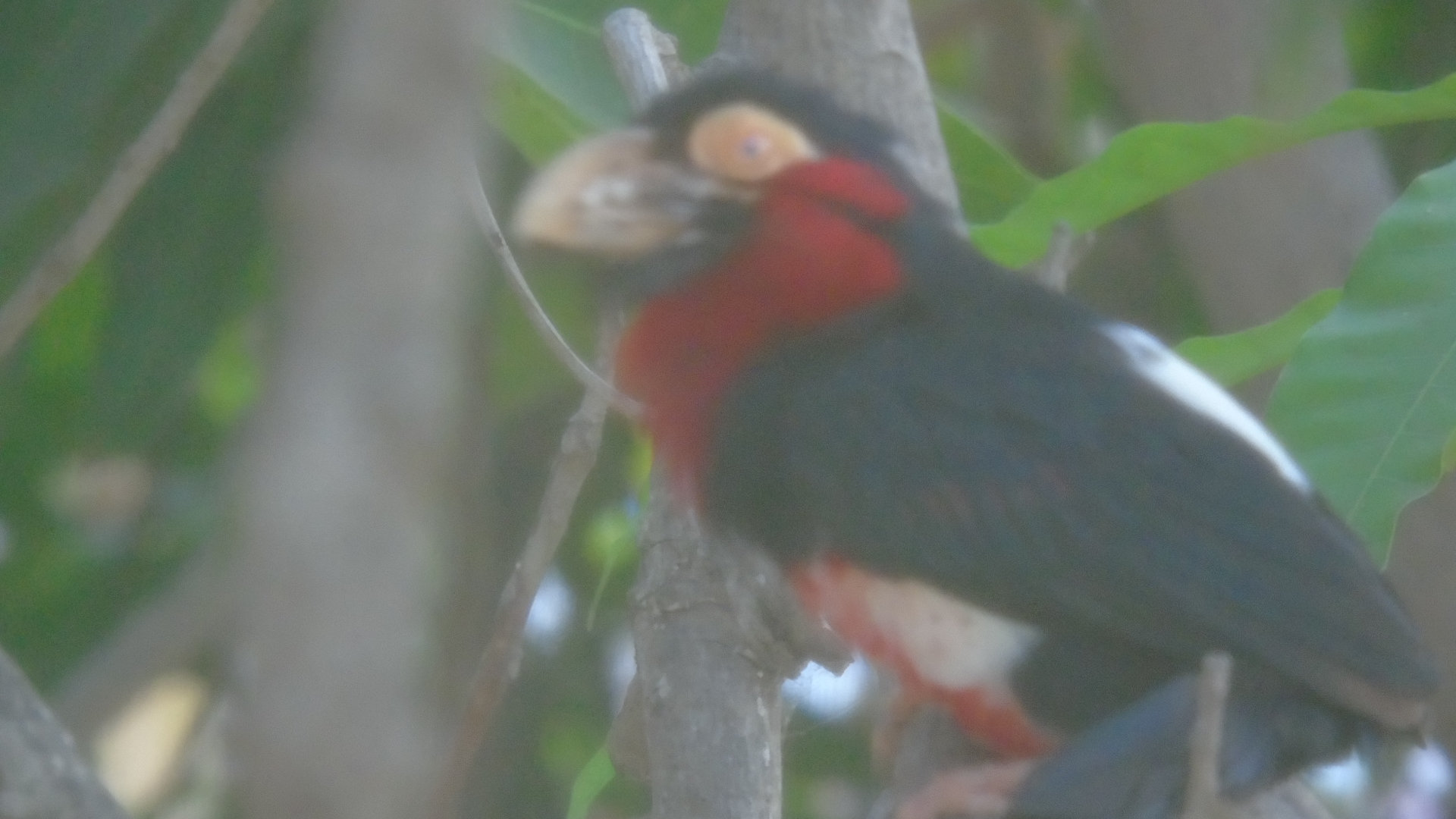 there are a pair of Bearded Barbets in the tree behind us. Photo taken through the fly screen , so apologies for the poor quality.