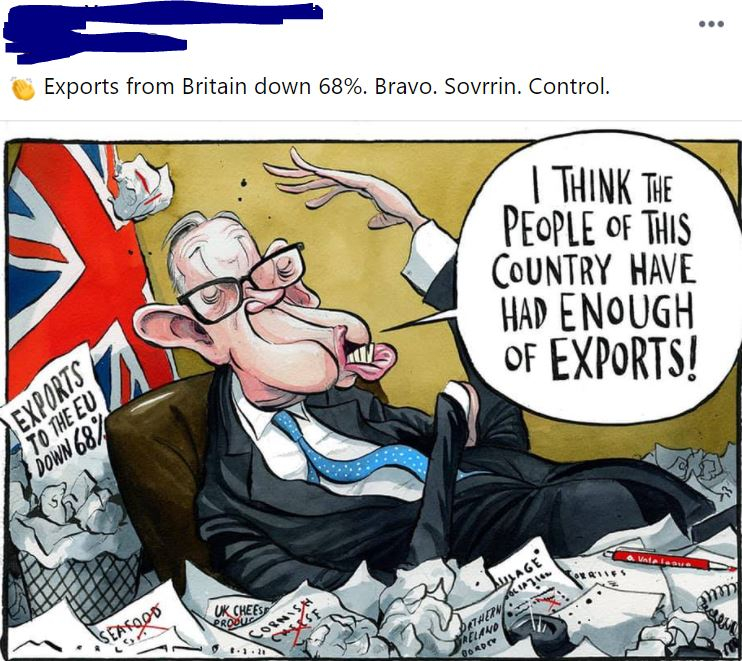 Just heard on the news that British shops in the EU have no custard creams or baked beans; lots of bare shelves. Nothing to do with Brexit, of course; just the fault of the EU...