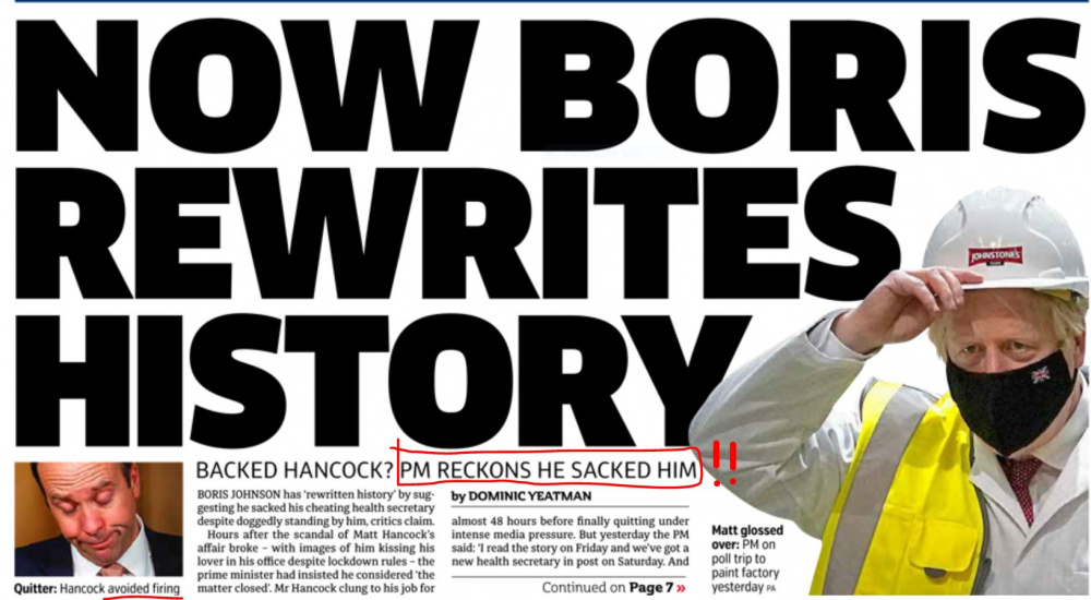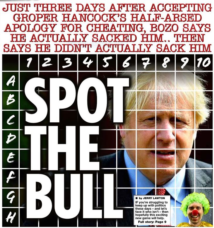 Just watched the news; bojo is claiming he acted swiftly in sacking hanCOCK!!!