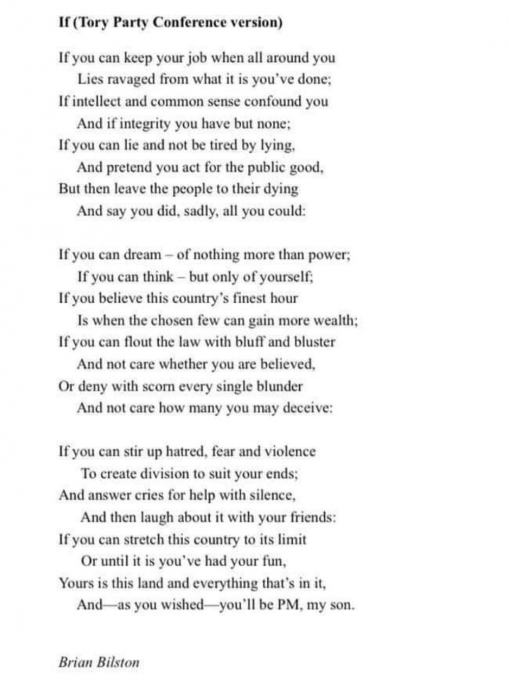 Martin Luther KingWe have kept our promise: Levelled UP the North and all the poor who cannot donate to the Tories, decorate the no. 10 flat for its current occupiers, feed them on free organic food (discreetly delivered, of course), pay for nannies, holidays etc., etc. by cutting their £20 a week help.