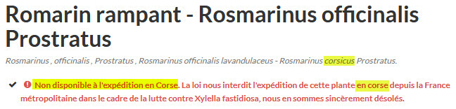 Which translates to "Not available for shipment to Corsica. The law prohibits us from shipping this plant to Corsica from metropolitan France as part of the fight against Xylella fastidiosa, we are very sorry."