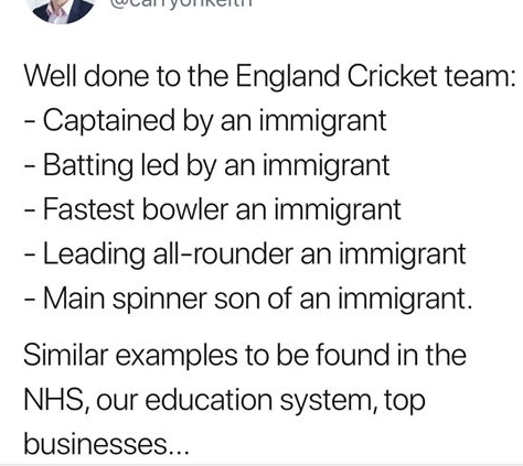 OH, who is a true cricket fan, loved seeing this truly multicultural team, and England fans of all ethnic backgrounds proudly holding the Union and St. George's flags. It showed that the flag will never belong to the far right, no matter how much they try to claim it. Very PROUD day for England!