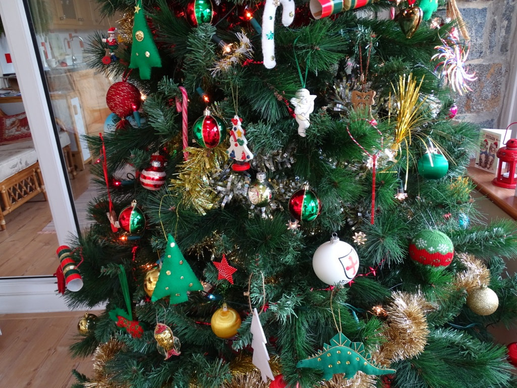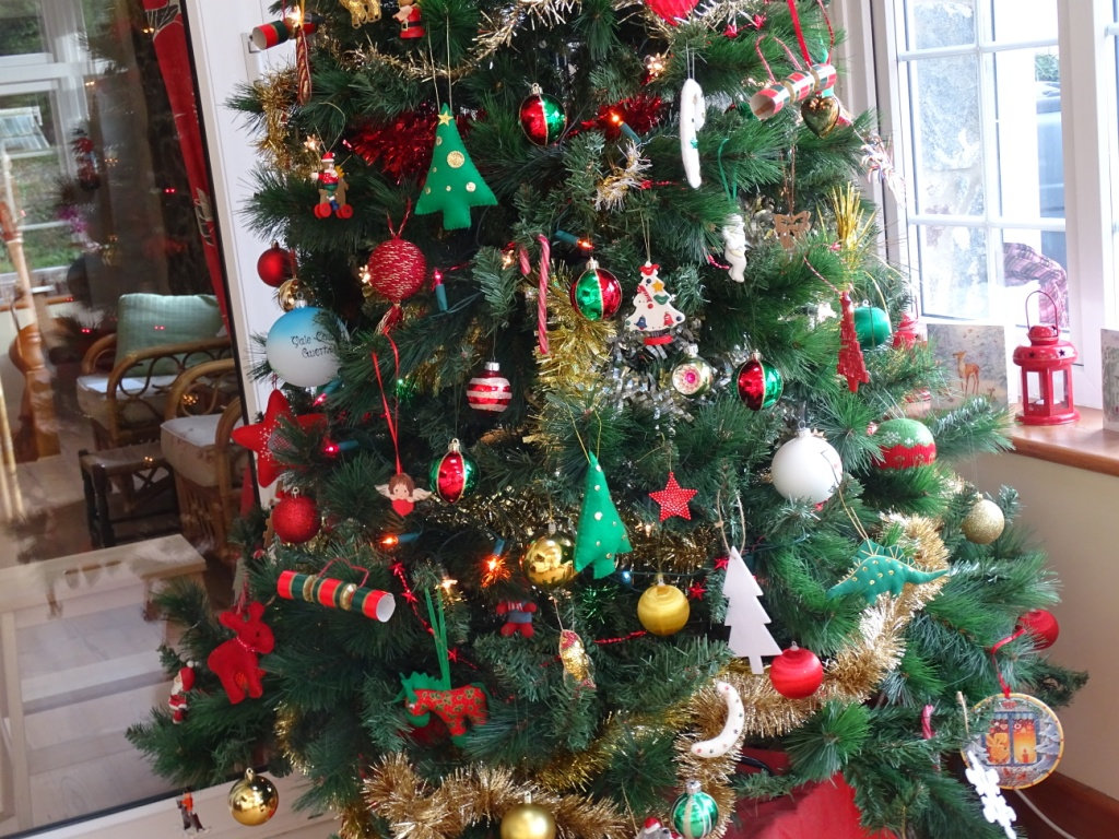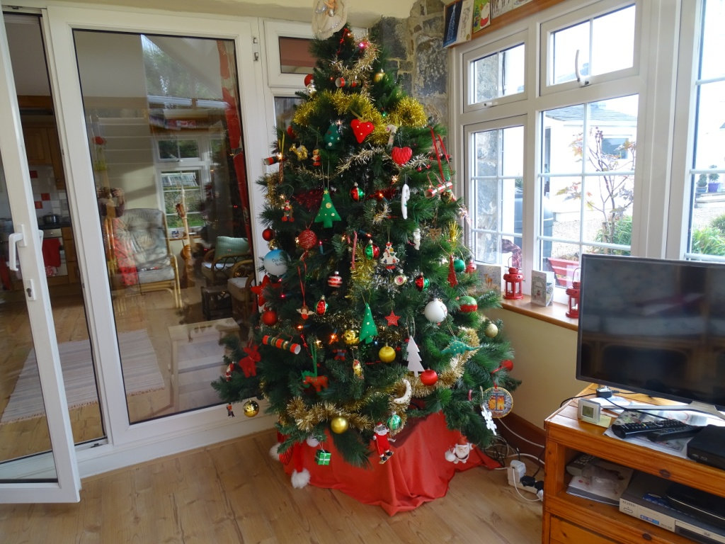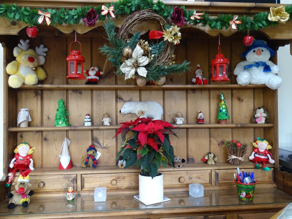 The outside lights are yet to be photographed, in the meantime here are a few of our indoor decorations. Mostly the same as last year with a couple of additions.I chopped the angels head off - (not literally) on this picture. I bought her from Wollies in 1973 - she is looking good for her age. You can see a right tangle of cables which I had forgotten to tuck behind the television.Some of the felt decorations were sent to me by an American penpal 50 years ago. They have worn well.I love this dresser bought in a local auction for just over £100 in 2013, it is solid wood and our daughters think it is dated and dark, but we love it. Most of the soft toys were my mothers, I love them too.