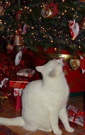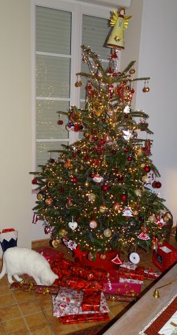Here's our tree, all red and gold, with a pussycat investigating ribbons on prezzies and then with his eye on one of my home-made, feline proof, felt baubles. He attacked and it survived.