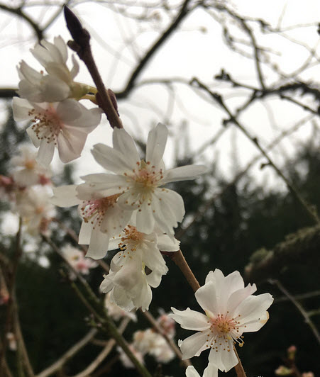 My guess for the white-flowered shrub (or small tree, perhaps) would be the winter-flowering cherry, Prunus subhirtella autumnalis. But @chicky might have seen a label...