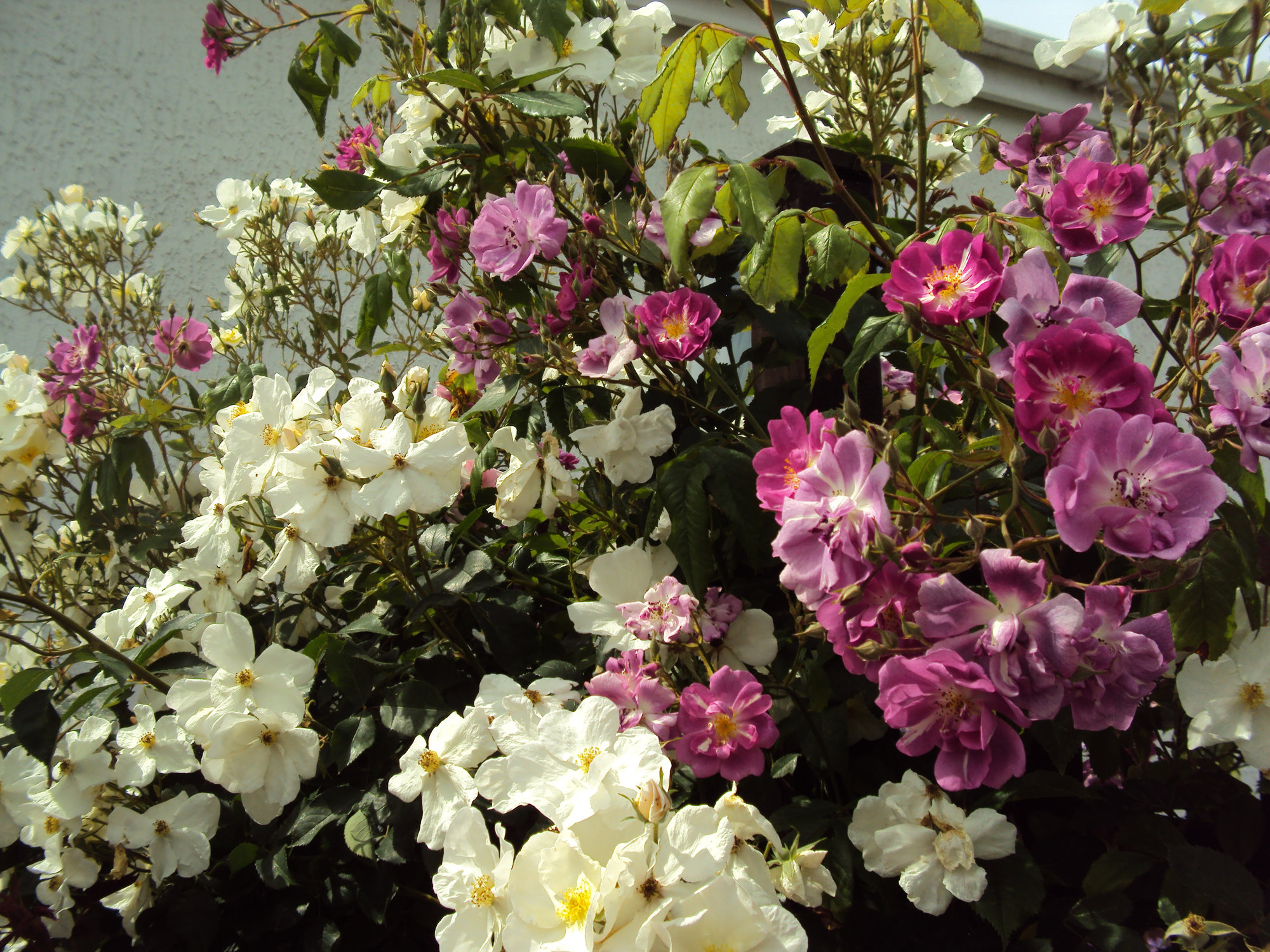 ...If you want more rose options I can give you those... for a more informal look, I enjoy 8 foot tall, thornless free standing shrub rose, 'Kew Gardens' with rambler 'Purple Skyliner'... both flower from June to November...