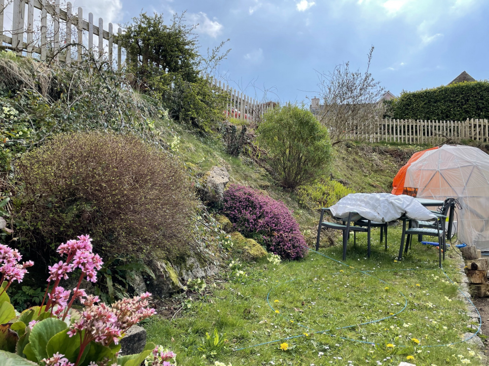 This is the area in my original top picture - I think the hot tub dome is very subtle. You can just see the many many primroses, and one the m6 roses just in bud. At the top on slope above dome is a wisteria which has responded well to merciless but necessary hacking.