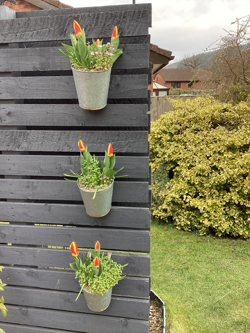 No gardening today here by the looks of the weather but yesterday I admired my pots of miniature tulips and my new lightshade which looks like it should be in the garden!