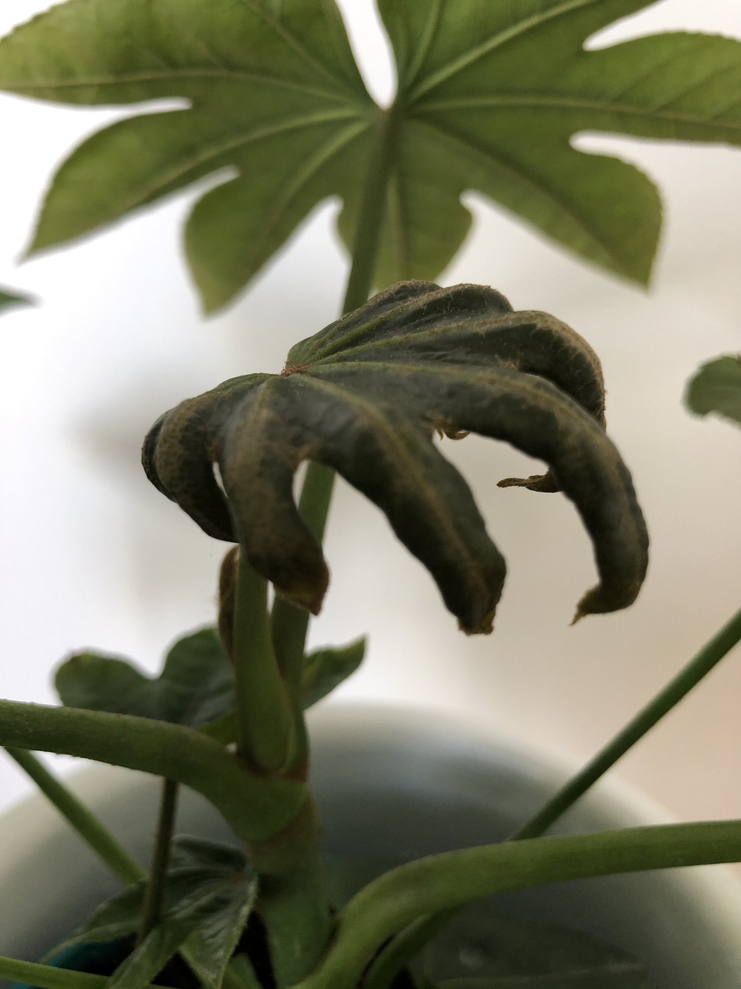 I have an indoor Fatsia Japonica that has been going strong since I brought it home a couple of months ago. However, one of the new leaves seems to have become very hardened and brown - I can't tell if it is a sign of disease or of me under or over watering, as the rest of the plant seems quite healthy (I water it once or twice a week). I did some research and it seems that new growth/buds are brown and furry, but this seems to be next level. I was misting the leaves quite frequently as it's been really hot here in the Aus summer, so I wonder whether I might have overdone that and that was the cause? I've been misting less in case it was (there's also a layer of pebbles at the bottom of the cache pot to help with humidity and to make sure the roots aren't sitting in water). No change to the brown hardened leaf though. I've attached some photos.