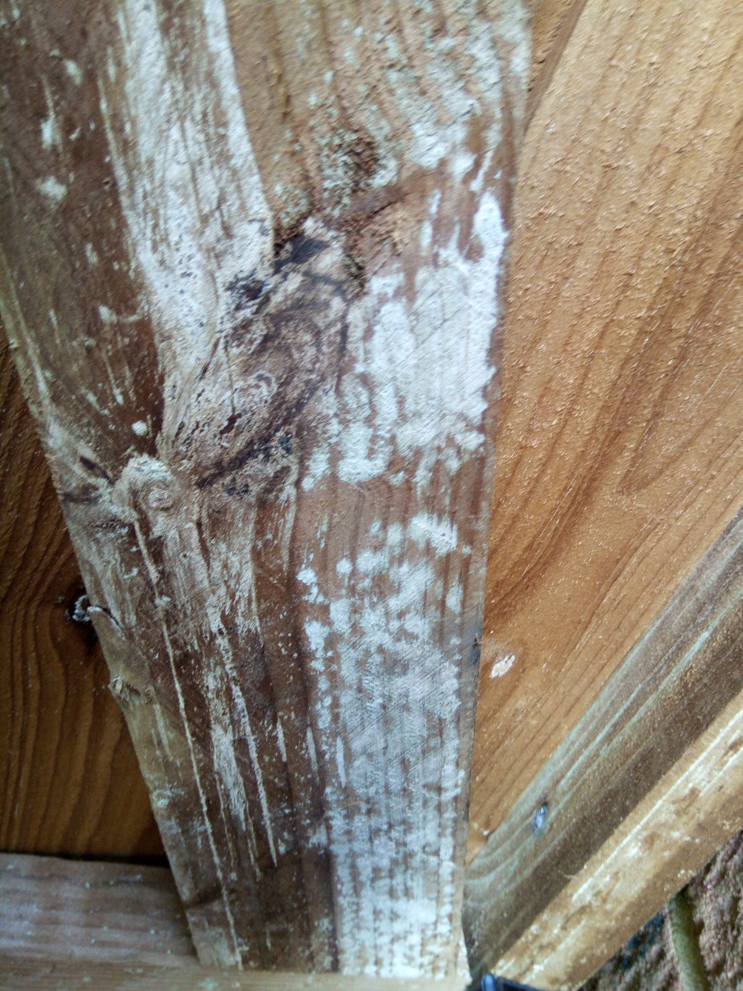 Had a go with just brushing it off (used a light scouring pad), no bleach at this stage, and white dust just come off it. However, seems to have made it worse as its blending all the colours into a bigger patch. I'm considering just painting over it to be honest