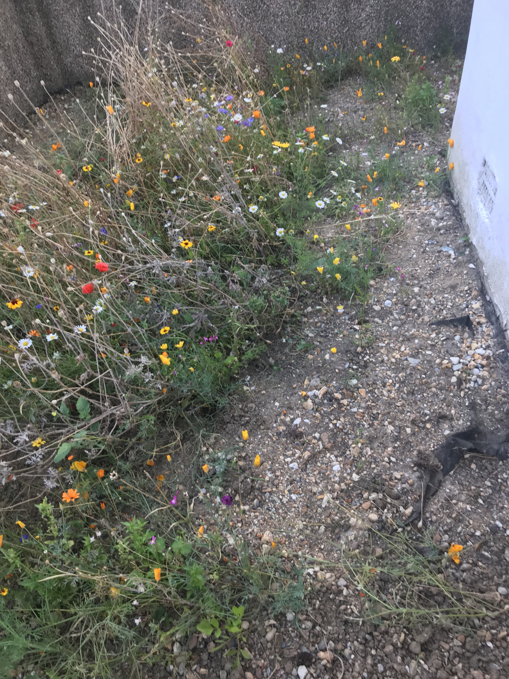 This is what it looks like know. Around the edges you can see it is basically a mixture of hardcore and not really very much clay soil. It is south facing - I lifted up the pacers hoping to find soil but instead it hardcore, a layer of membrane and then concrete broken up in some bit. I think you can grow wildflowers anywhere!!!