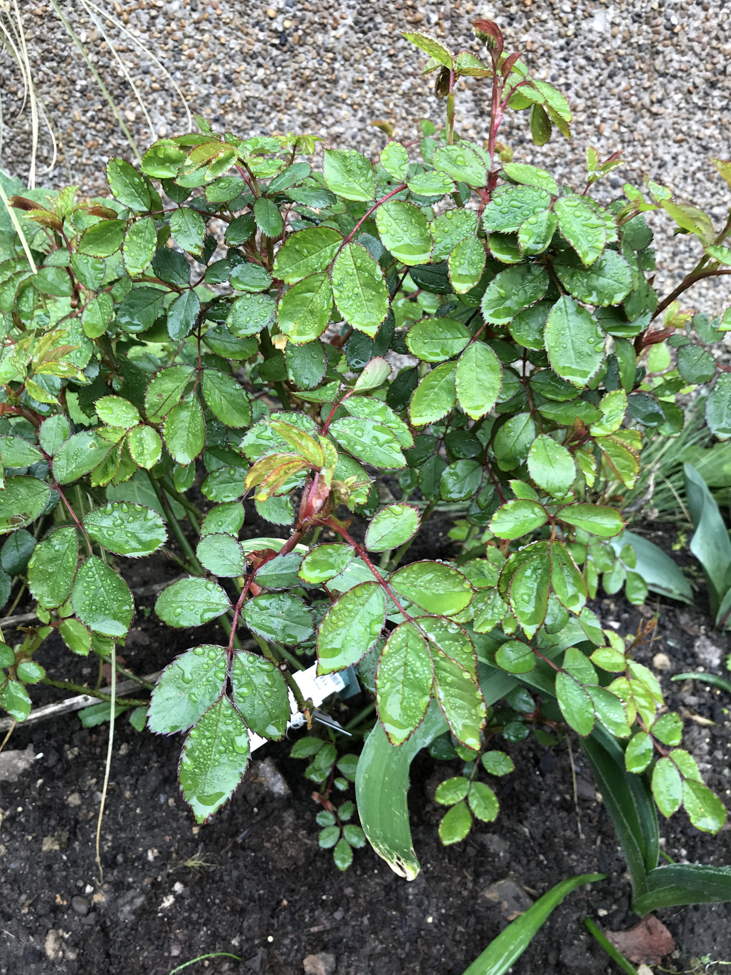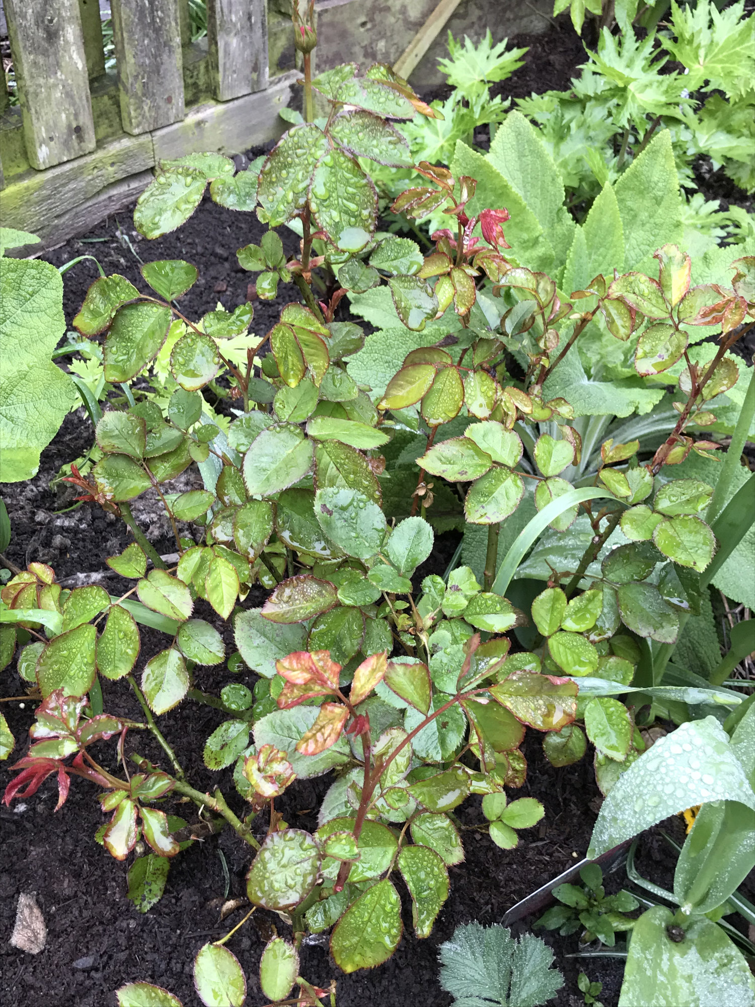 However, one of mine, the one top left in this picture, has rose replant sickness and is behind the other two... I hoped it would recover this year, but I'm not seeing that yet.. it was treated with mycorrhizal fungi at planting, which goes to show that stuff is more hype than substance..