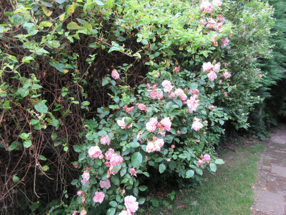 This bit all needs tidying up, the honeysuckle has a lot of brown in it and is smothering the rose, which has come detached from its wire. It is more apricot than it looks in the photo, has darker buds, smells wonderful and is quite prickly, could be Albertine.
