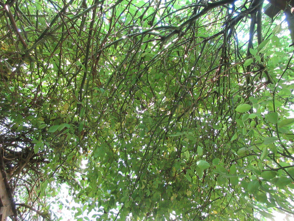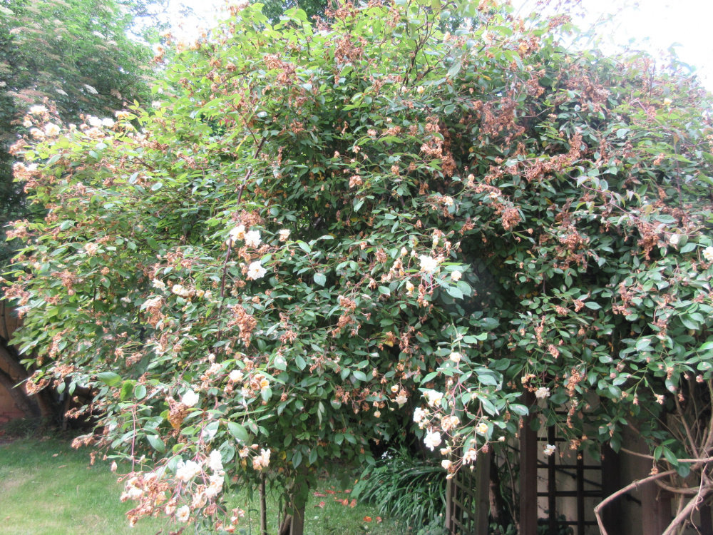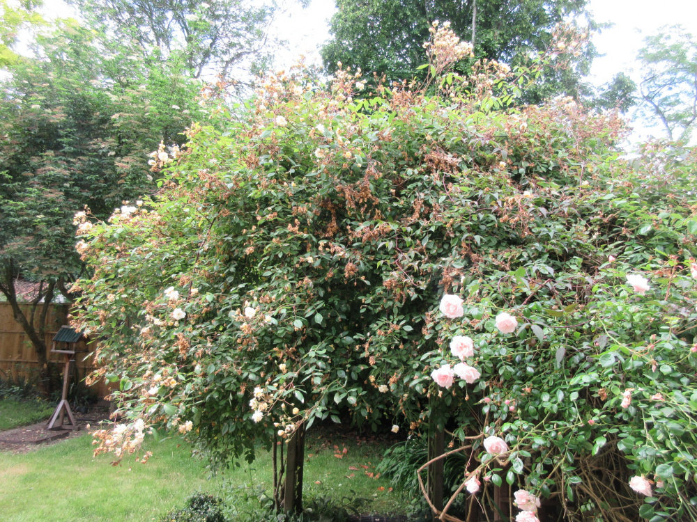 This is the Malvern Hills. We have been in this cottage less than a year and I don't know when it was last pruned properly. I cut quite a bit off early this year, I could walk upright under it then, now I have to stoop quite low. It's on an arch and is about 4m high and 4m wide. As it's repeat flowering I don't know what to do about pruning it. Should I just dead head it now, cutting about a foot off each flower cluster? Underneath is a mass of tangled twigs.