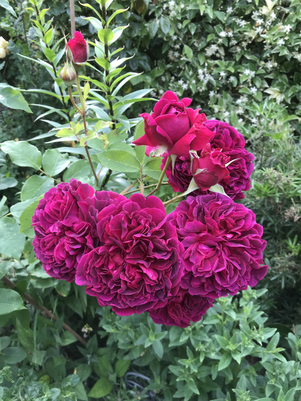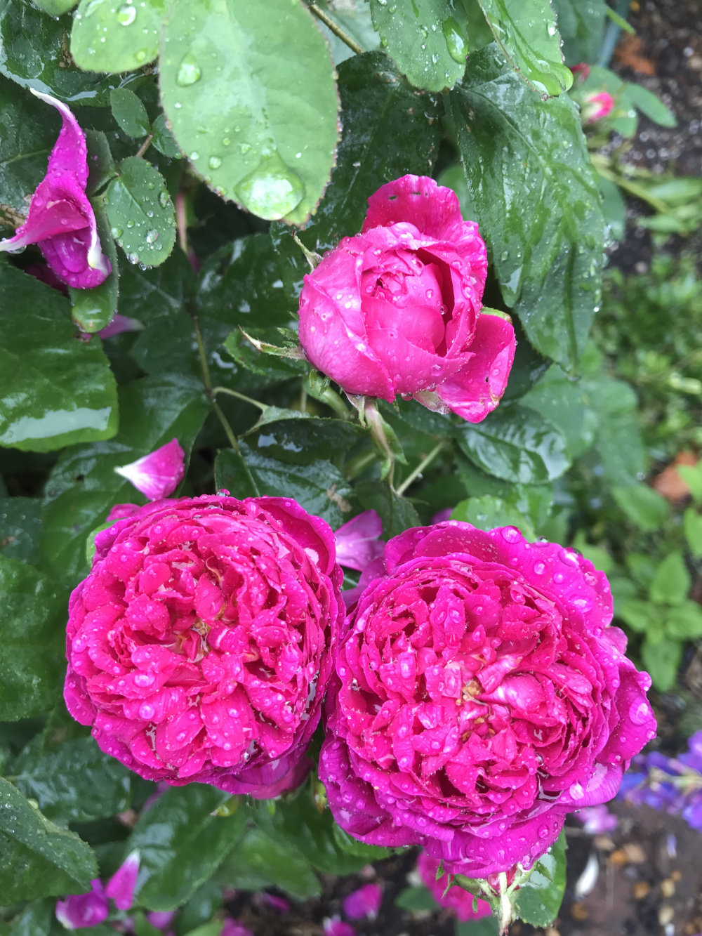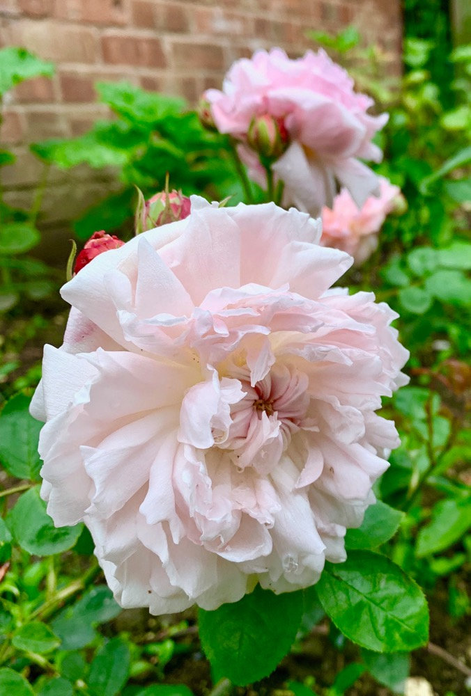 jubilee celebration first bloom! Lots of buds though Susie just getting going. Lovely perfume and super healthy bushy foliage. Some blooms are whirls some of fashioned style. The ancient mariner holding up in the rain.