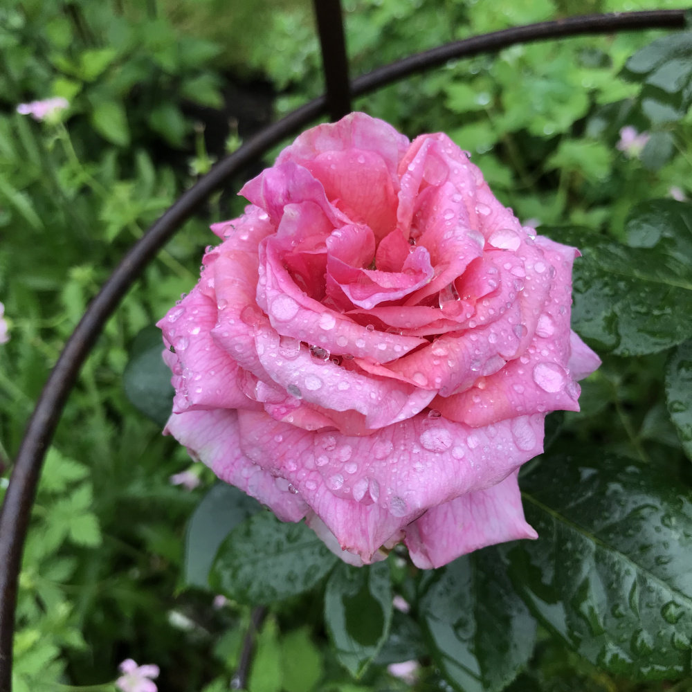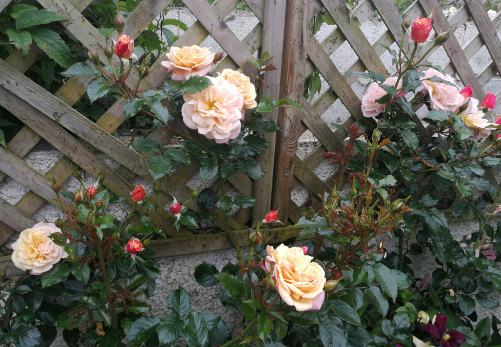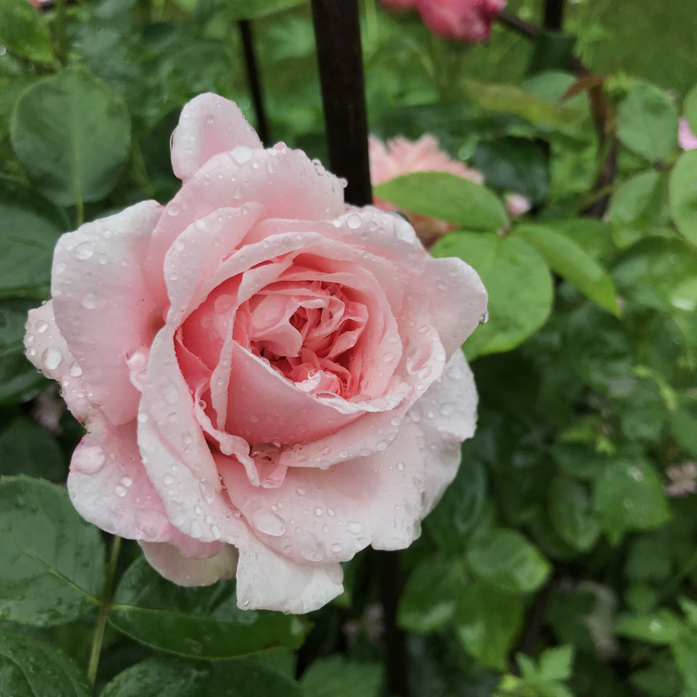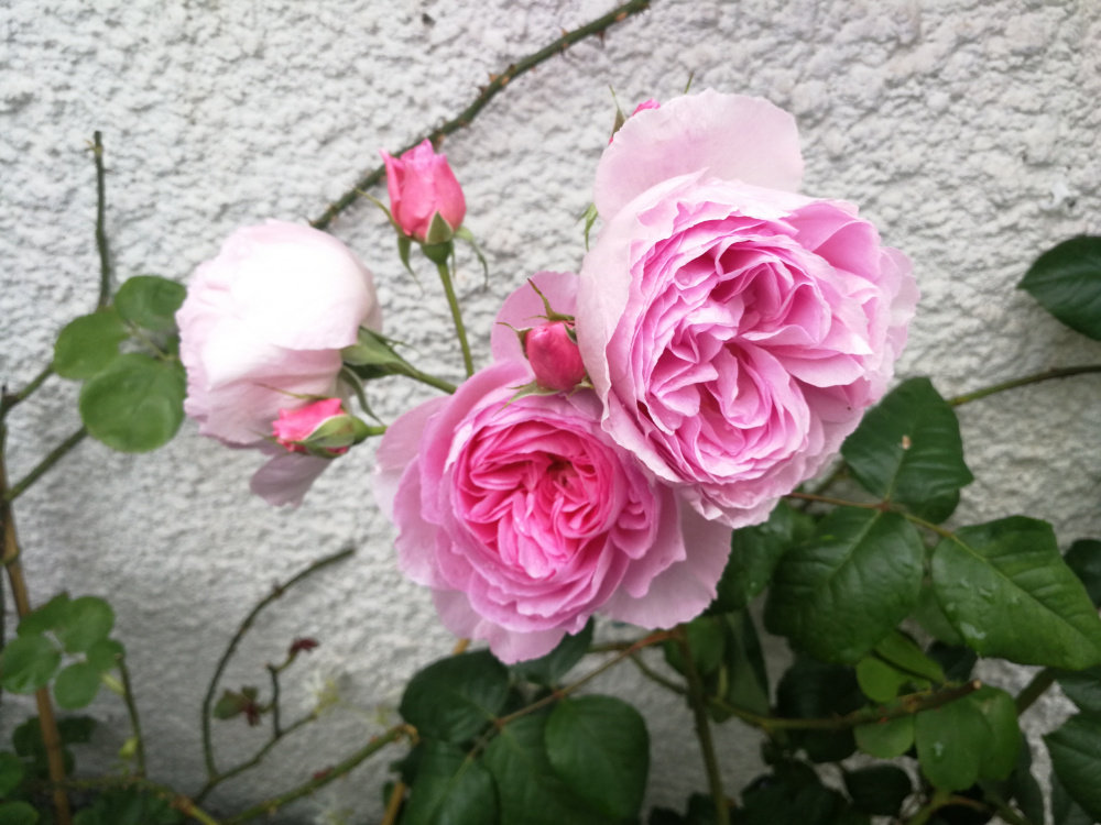 jubilee celebration first bloom! Lots of buds though Susie just getting going. Lovely perfume and super healthy bushy foliage. Some blooms are whirls some of fashioned style. The ancient mariner holding up in the rain.