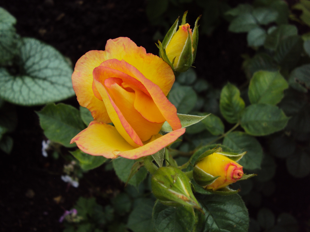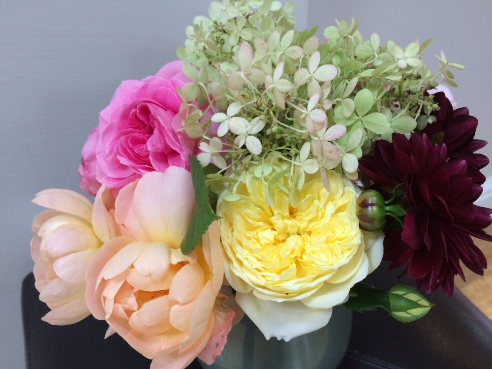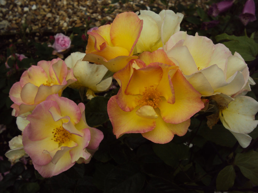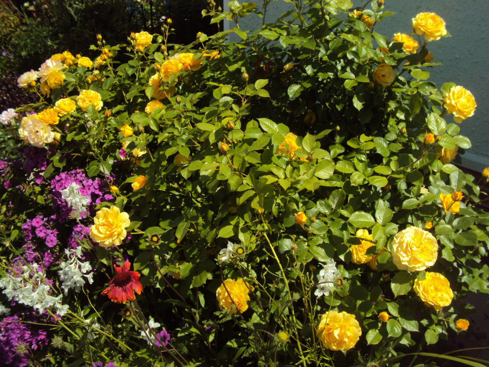 I am in need of colour combination advice. Imagine an apricot coloured rose with orange, pink and yellow hues (The Lark Ascending, for example, or something similar) and that you want to combine it with another rose close to it. What colour would you choose?