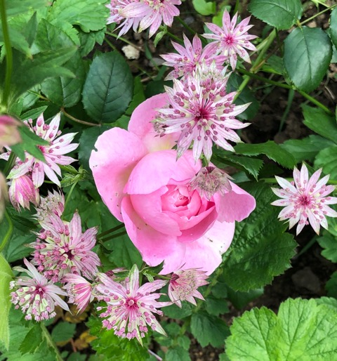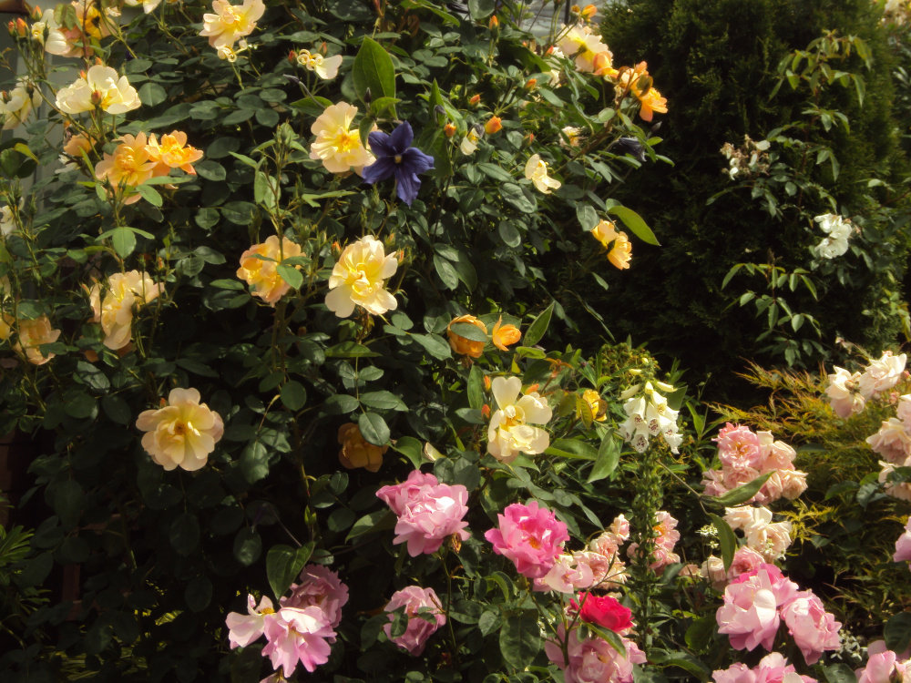 I don't mind colour clashes with roses but if you are thinking of growing The Lark Ascending... I feel I should advise that.. it's very thorny... very vigorous... capable of 8 or 10 foot tall, but is very beautiful ... flowers like water lily's all over the bush from top to toe... it's not a rose to mess with too much.. prune hard during winter as it will soon be 6 foot tall by June..