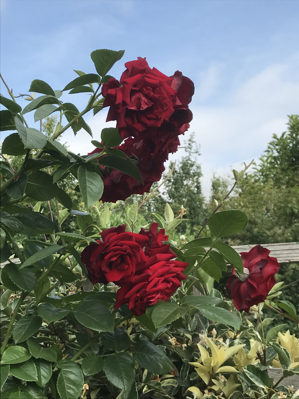 Crimson Cascade - stands up to the heat well for a dark red rose. Much darker in cooler weather. Zero scent but that’s not a problem at the back of the border.
