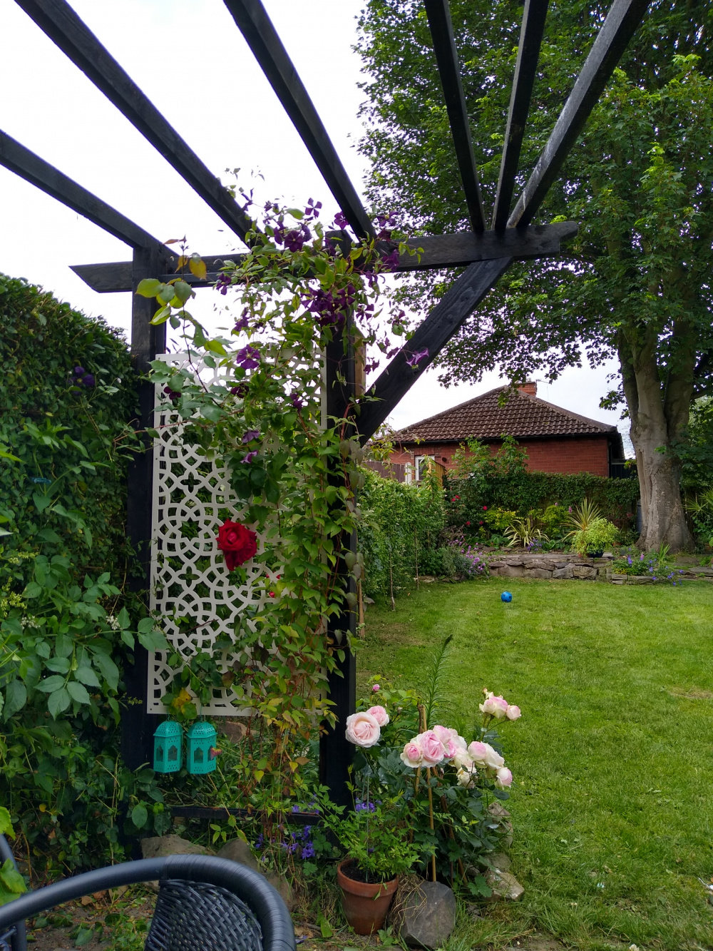 My new rose pergola is coming along slowly . Ena harkness climbing rose with rose 'Eden'.