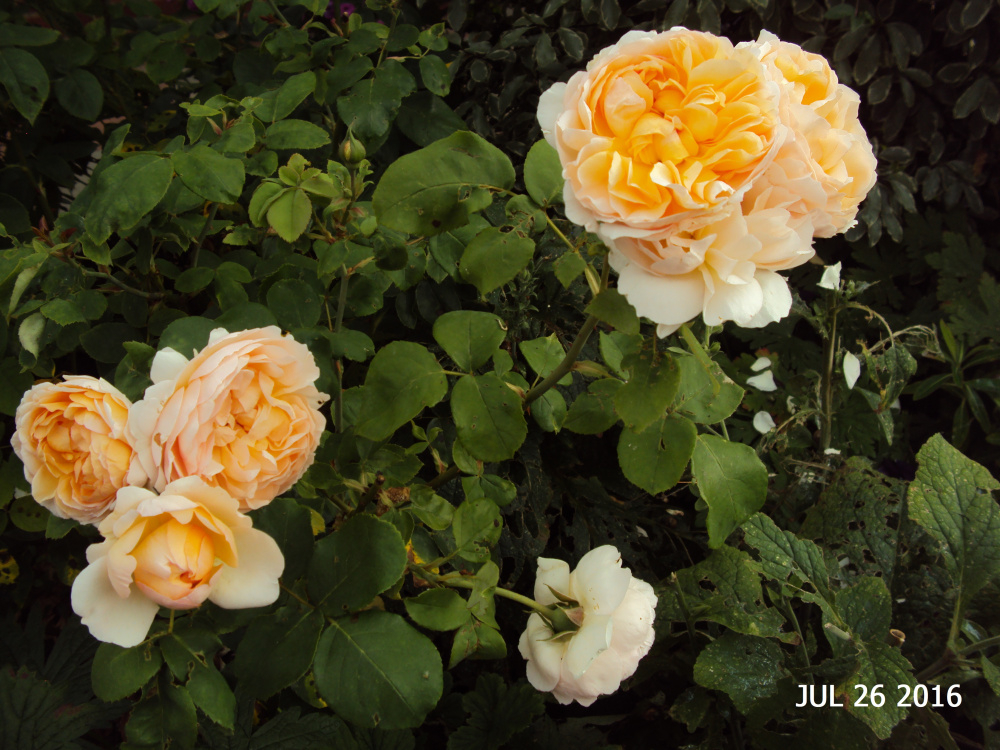 It can be a colour changer, mostly apricot with lighter (white) outer petals, fading to white or light pink, sometimes it has more pink in it and sometimes more or less yellow centres, buds can be dark pink or light pink or apricot mixed with yellow. It's a balanced shrub, approx. 4'x4'. Light to medium green foliage, very prone to blackspot. Medium tea fragrance.