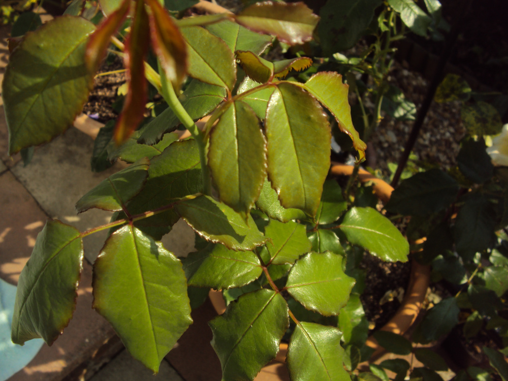 ..in very strong sun today... ..like most roses this time of year, it does blackspot on the old foliage which it wants to drop, so you remove by hand... sprays are futile right now... leaving way for this gorgeous fresh foliage, all nice and clean...