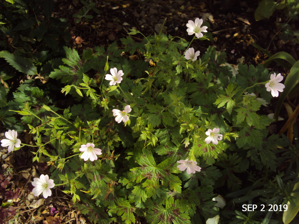 Geranium oxonianum 'Cream Chocolate'... oxonianums are long flowering Geraniums of compact habit... never straggly like Rozanne.. May to October.. very suitable with roses of all kinds...