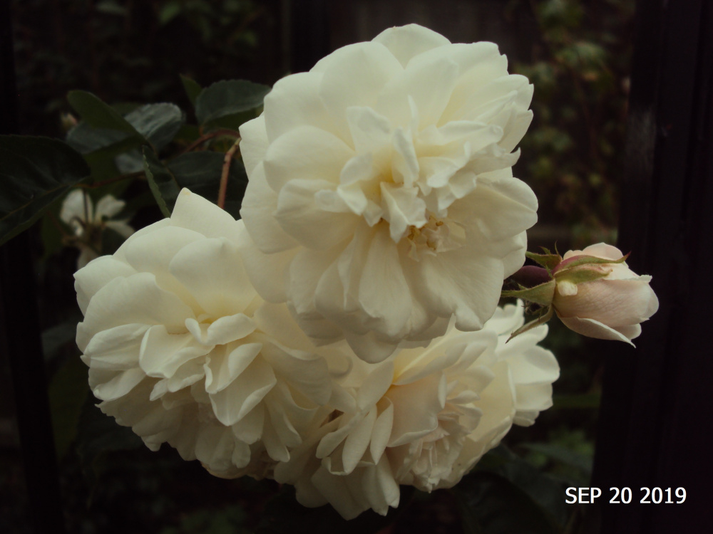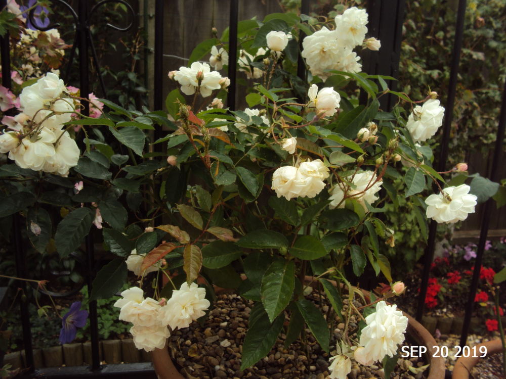 ...this is 'Marie Pavie'.. growing in a pot... a perpetual flowering, very healthy Polyantha shrub rose with sweetly scented, muddled bloom.... very useful for small gardens..