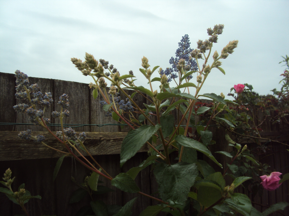 ..this is Ceanothus 'Gloire de Versailles'... I feel this is an essential shrub for the rose border.. treated like a Buddleia with hard pruning, but it's so much better... constantly in flower from late June to December... I had to move this one earlier so it's just coming out again...