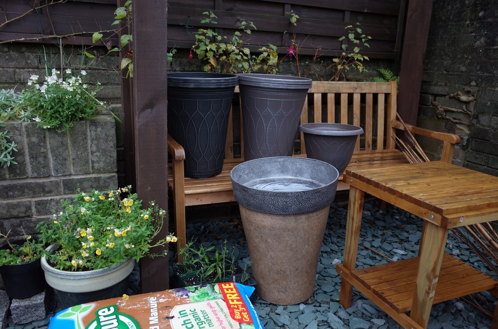 I received new pots today, they are a good compromise of size, cost and look, I am happy with them. The smaller ones are 47(h)x39(top dia)cm, the big one 55*43. I can put these on my concrete paths around the house without blocking the paths too much. They are 30l and 50l volume so should be still movable when planted (although just barely). I like the smaller ones more, they are the perfect size for me, not too plastic looking and they were £13 per pot. The big one isn't as good and was more expensive but fits exactly where I need it to fit. All are from eBay.